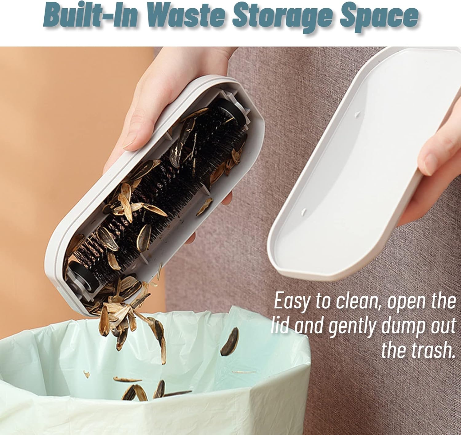 - 【TRASH COLLECTION】The table sweeper brush has built-in trash storage to easily collect and store dirt, pet hair, crumbs and more, so you don't have to clean crumbs off the table or by hand. Easy to clean, open the lid and gently dump out the trash.