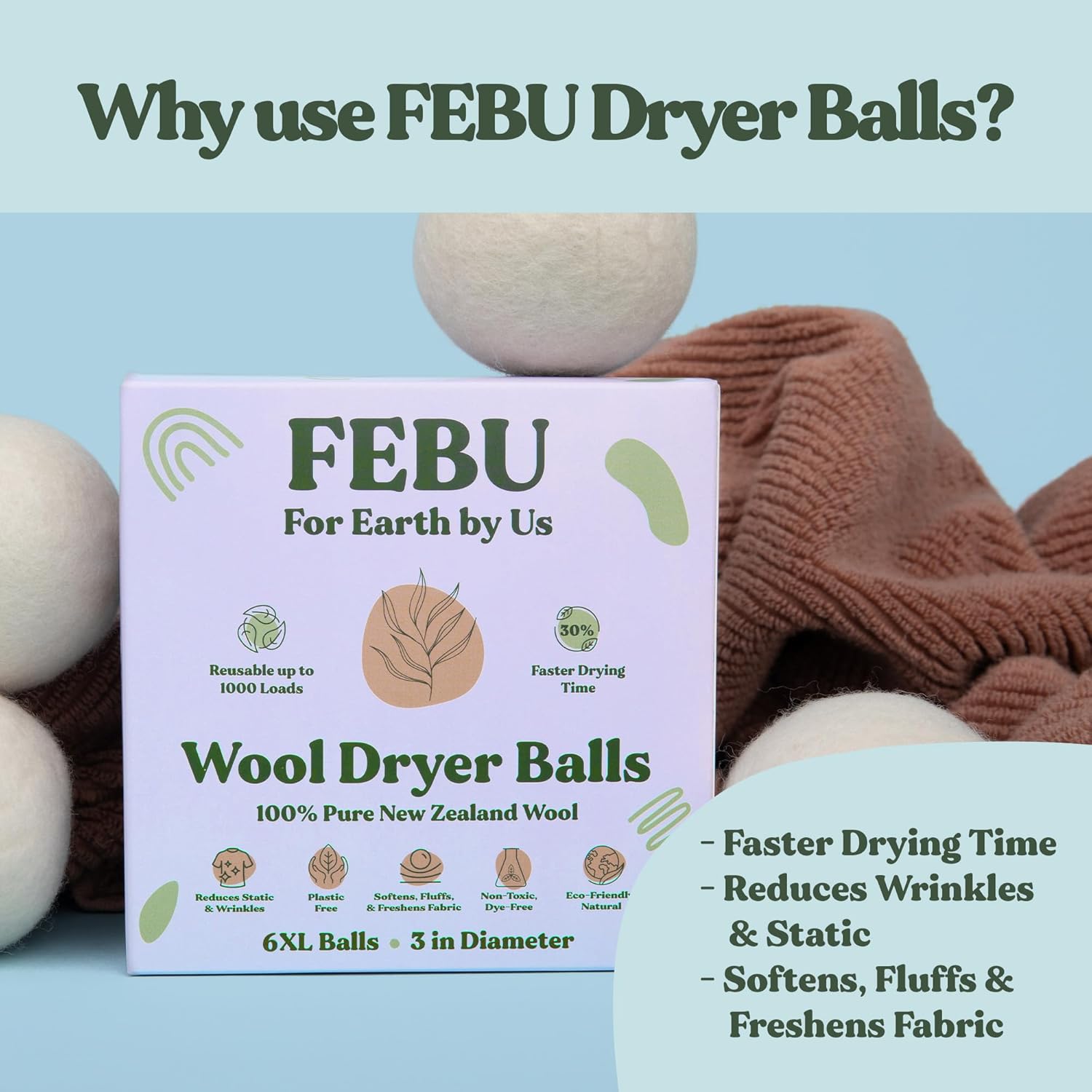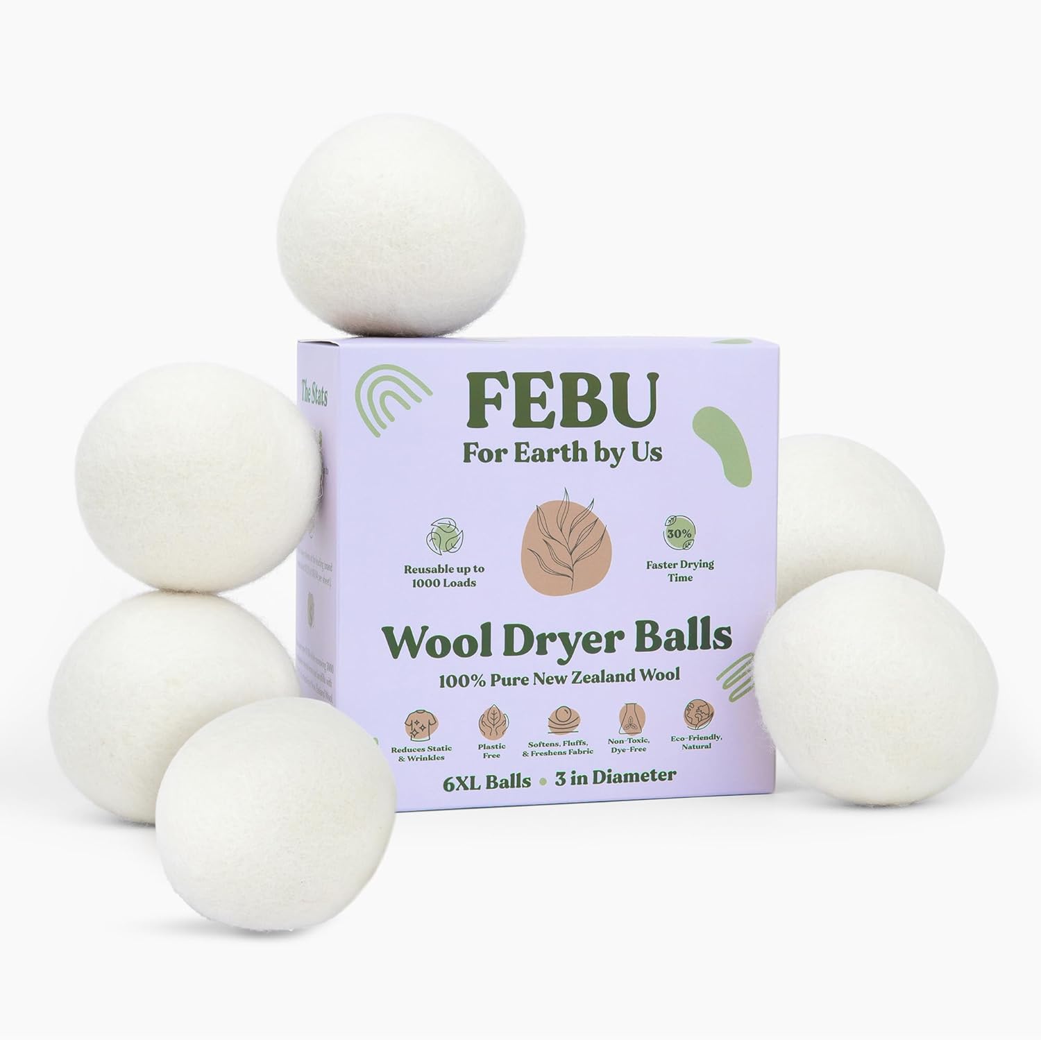 - MADE WITH 100% NEW ZEALAND WOOL — With no plastic or synthetic ingredients, FEBU wool dryer balls are crafted with only one ingredient: 100% New Zealand wool. Each wool dryer ball is reusable for up to 1000 loads.
