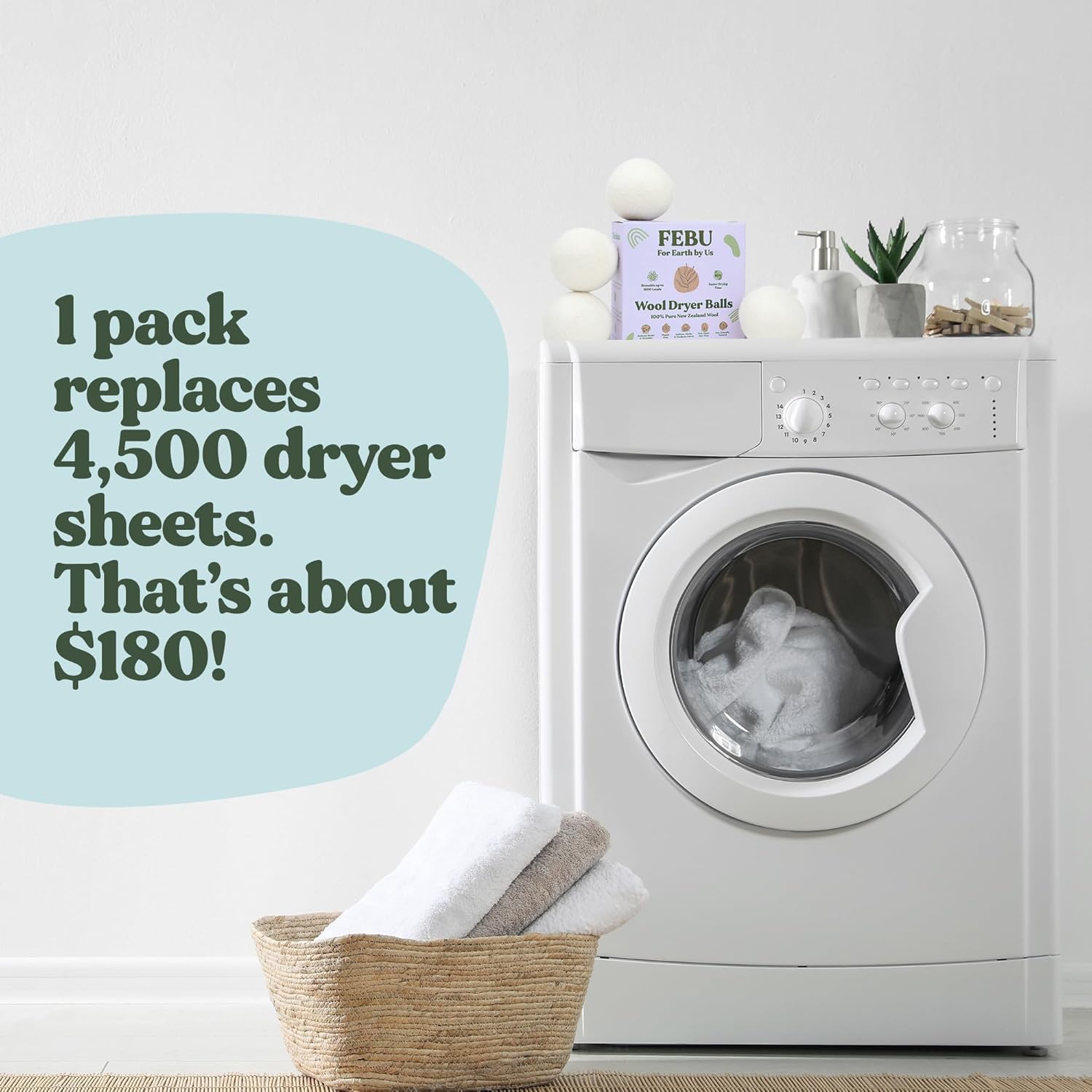 - FEBU DRYER BALLS SAVE YOU MONEY — 1 pack of FEBU natural wool dryer balls replace up to 4500 dryer sheets.