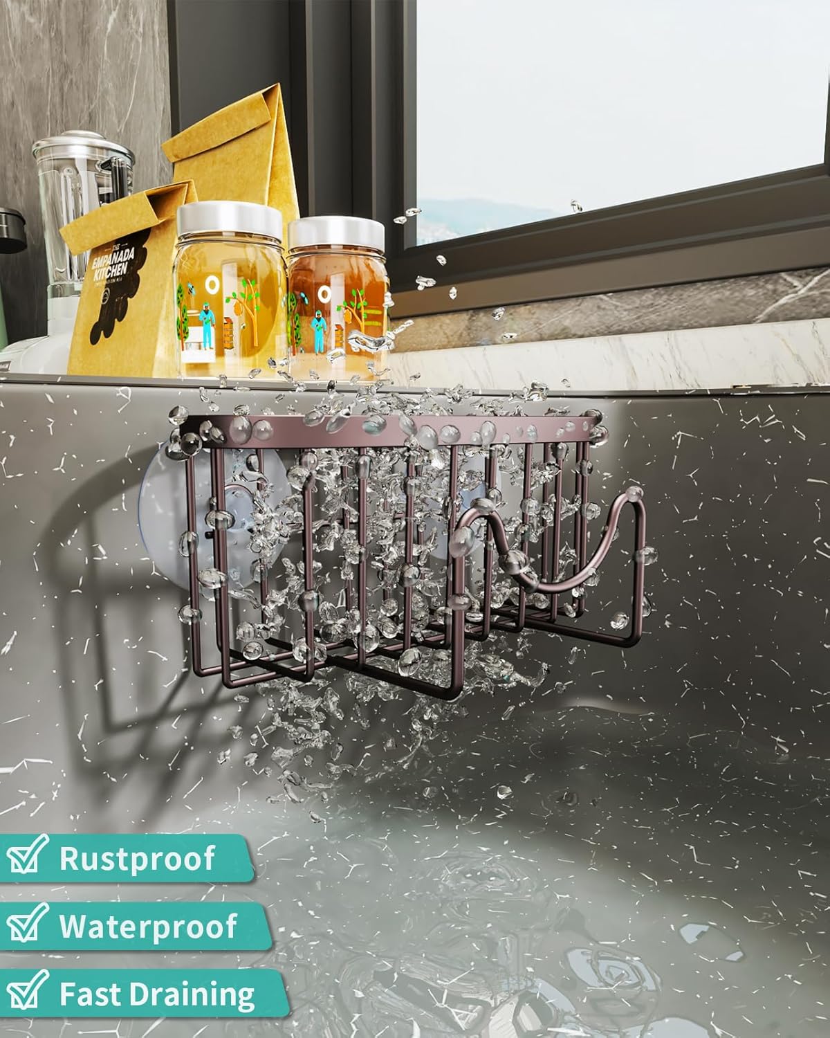 HapiRm Multifunctional Sponge Holder for Kitchen Sink with Unique M-Shaped, 2 Installation Methods Sink Caddy, Stainless Steel Kitchen Organizer for Sponge, Brush, Sink Stopper and Scraper -Bronze