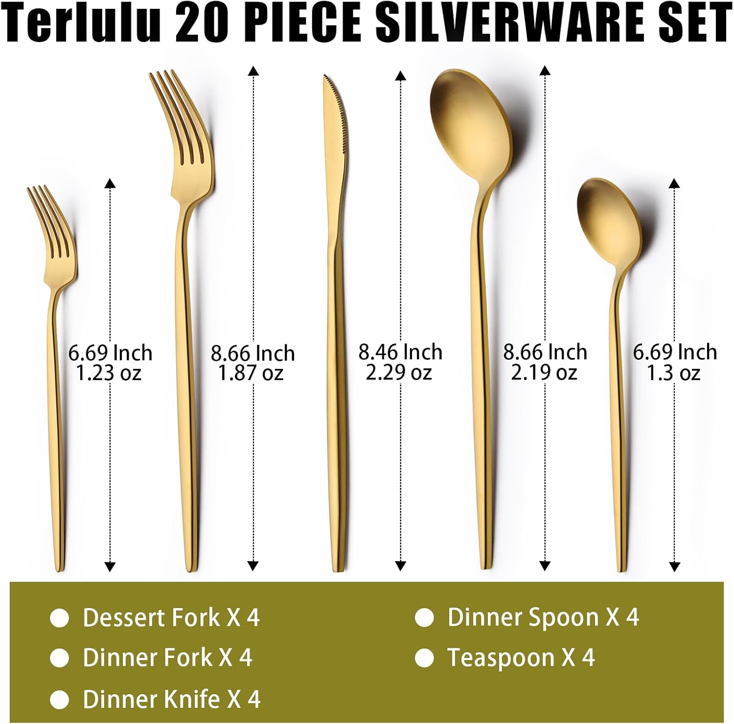 - ăSERVICE FOR 4ă Terlulu 20 piece gold silverware set for 4 includes 4 dinner forks, 4 dinner spoons, 4 dinner knives, 4 teaspoons, 4 salad/dessert forks in normal size, perfect for most families.