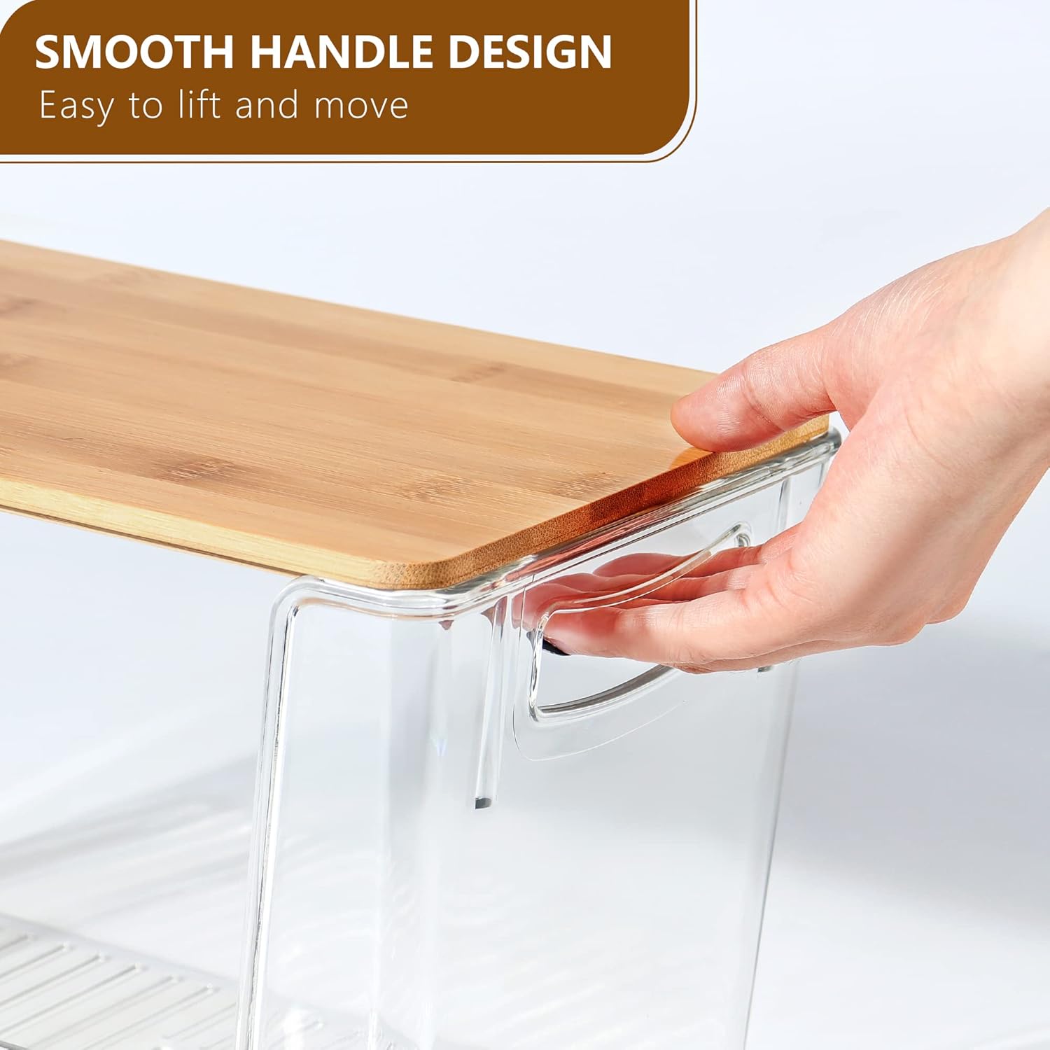 - Bins stack with bamboo top to create space-saving, vertical storage in kitchen spaces; The open fronts provide easy access to stored items; It easier to grab items without removing the lid.