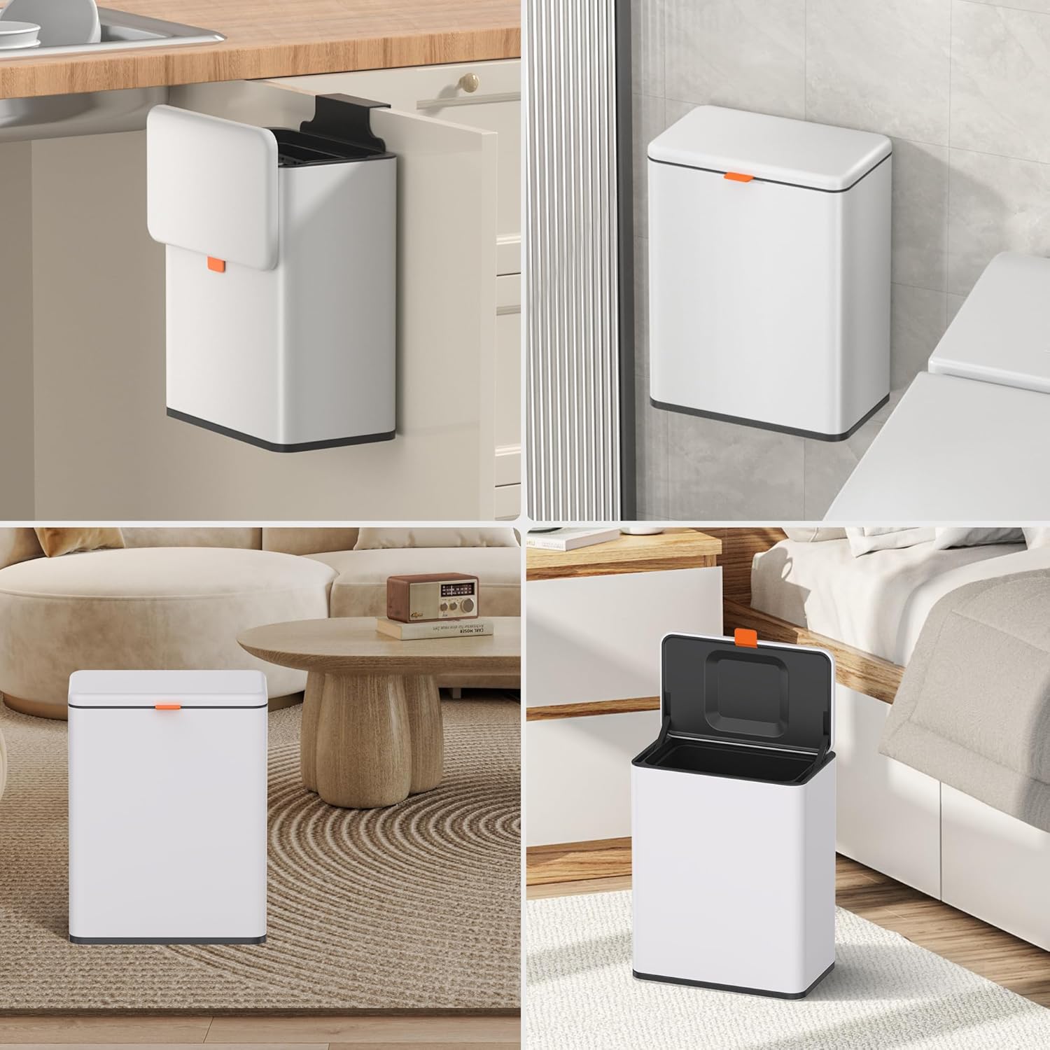 - 【WALL MOUNTED/COUNTERTOP/ UNDER SINK TRASH CAN】: No need to bend over. The trash can provide Two opening and installation methods,Effortless and Fits for Most Cabinet Doors, Pantry Doors. The thickness of door should be less than 0.98" (2.5cm). Small trash can can also be glued on kitchen or bathroom wall or under the sink.