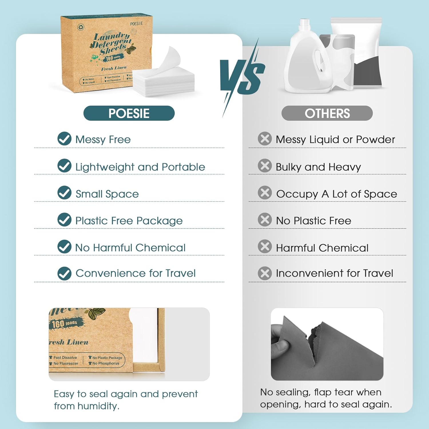 Poesie Laundry Detergent Sheets Fresh Linen Scent 160 Sheets 80 Large Loads Plastic Free Fast Dissolve Washing for All Washing Machine Traveling Dorm Life Save Space