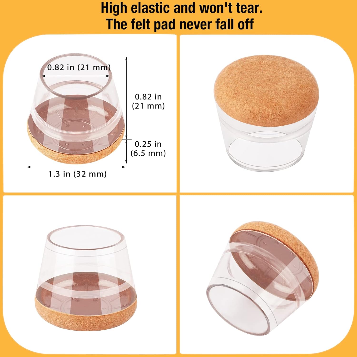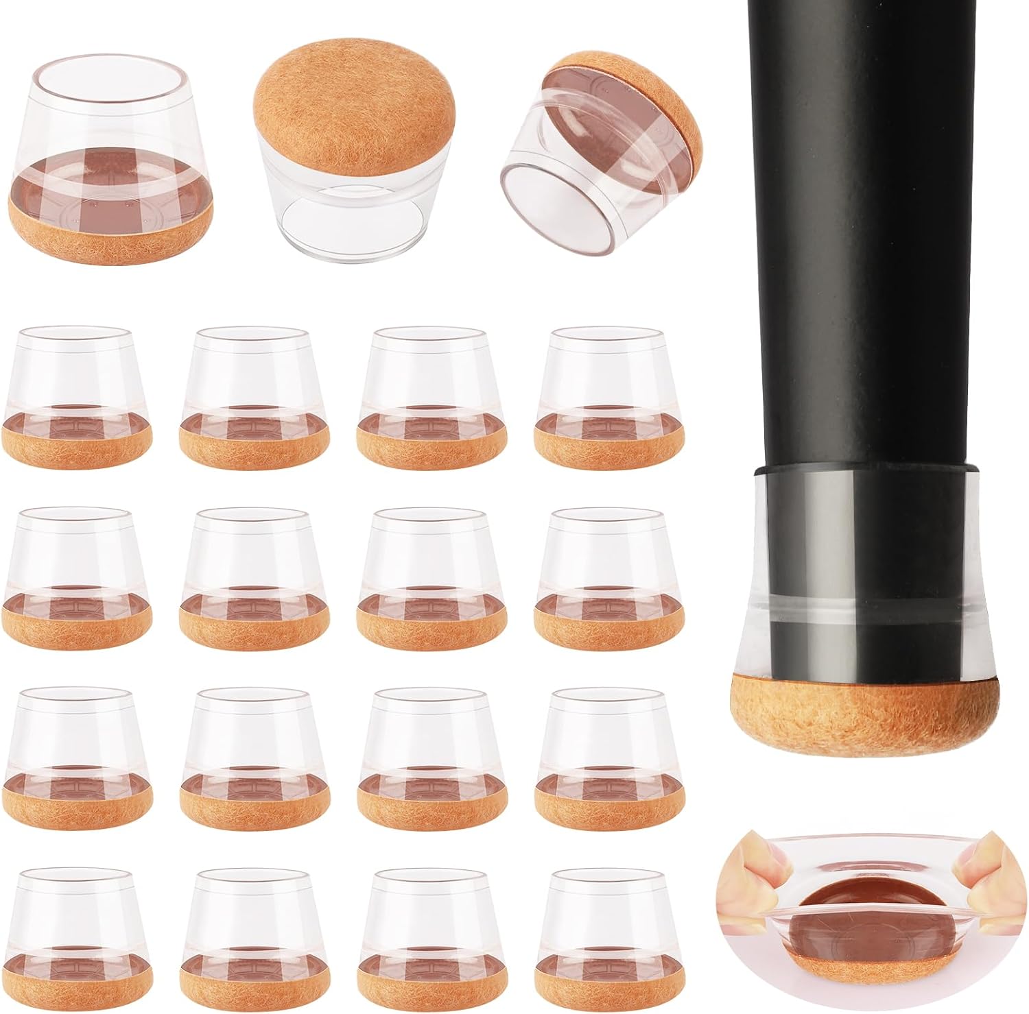 - 【Upgrade New Design】: 360° full felt pad bottom wrapped, which helps the felt bottom be able to touch the floor at any angle, preventing scratching the floor. Our chair leg floor protectors do not use gel. The bottom felt pad and the silicone chair leg floor protectors are integrated with a high-pressure machine to ensure that they will never fall off.