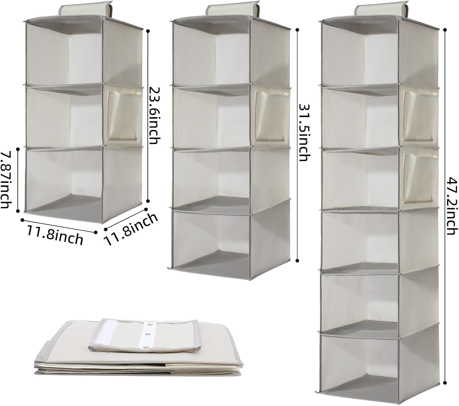 - ăProduct DimensionsăYou will get 2 packs of hanging shelves. This overall size is 11.8"(L)*11.8"(W)*31.5"(H). Each unit is 11.8"(L)*11.8"(W)*7.87"(H).Before buying, it is recommended to measure the distance between your closet rod and the floor to see which model would be best for you.