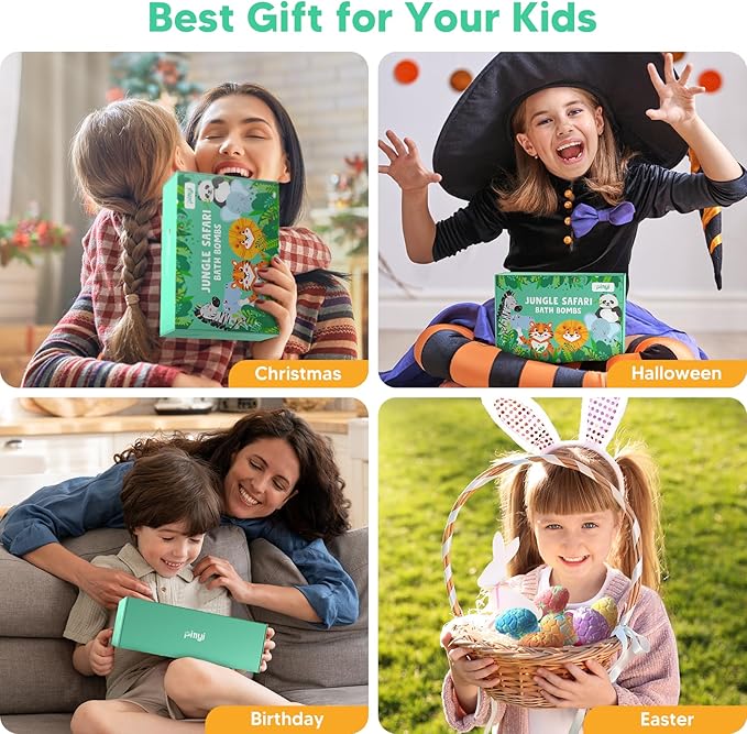 - 【Best Gifts for Boys & Girls】This bath bombs set is the best gift for Christmas, Birthday, Party Favors, Easter Hunt, Egg-Collect, Thanksgiving Day, New Year, Goody Bags etc., It comes individually wrapped in a beautiful gift box with vivid color, pleasant smell, rich foam and with surprise inside. It can be a perfect gift for kids 3,4,5,6,7,8,9,10 years old, and turn any ordinary bath time into an unforgettable evening!