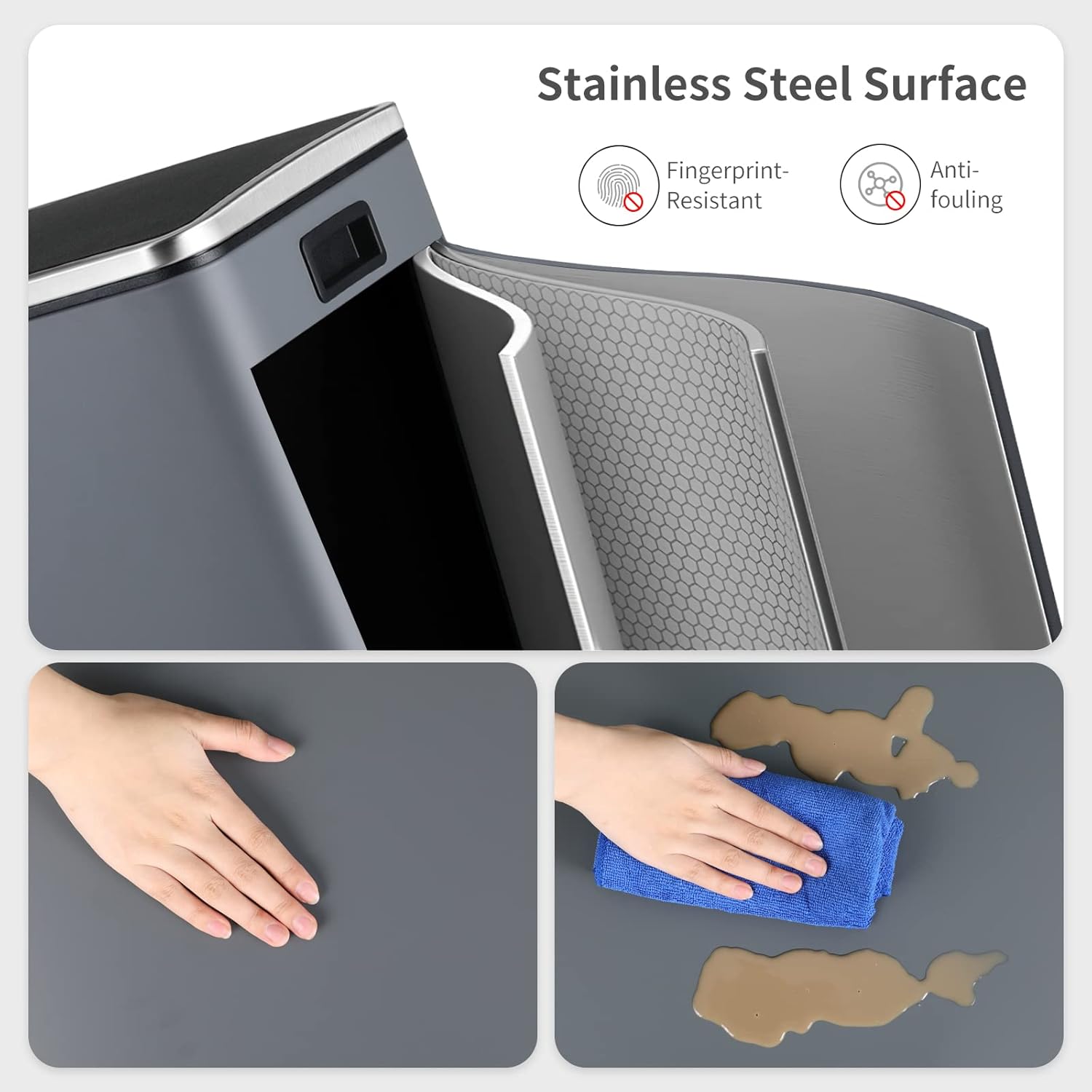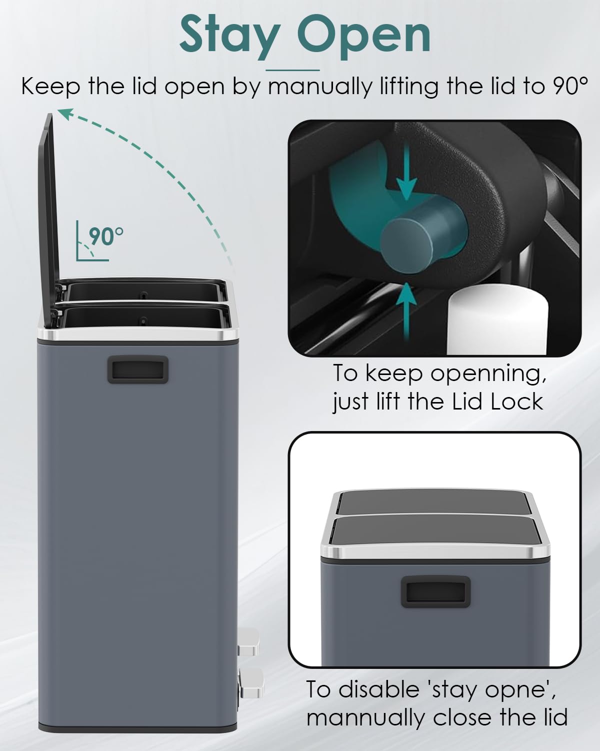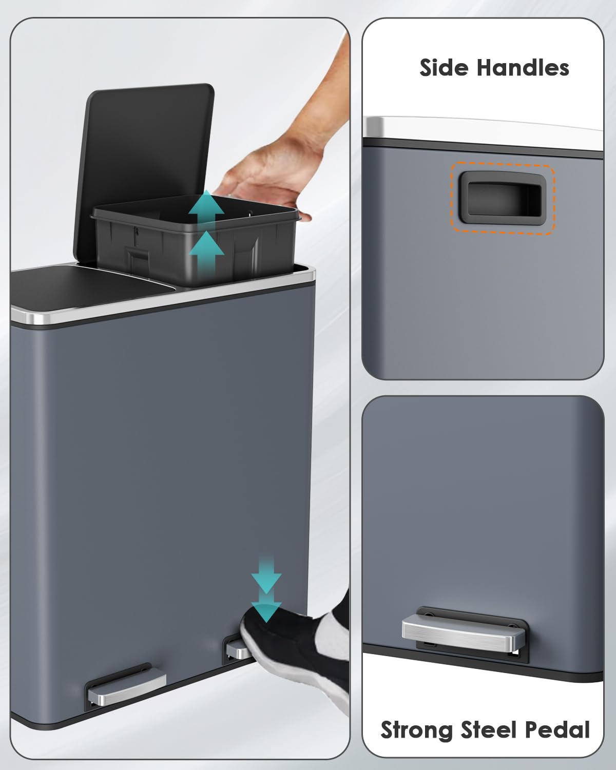 - 2*8 GALLONS COMPARTMENTS: Trash can has two independently compartments for trash and recyclables, making it easy to sort waste.