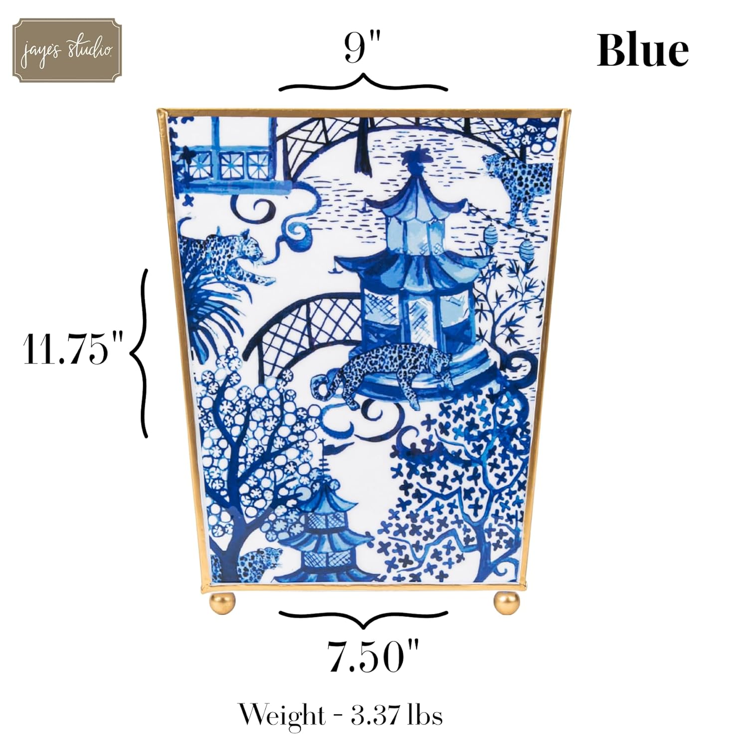 Jaye’s Studio Garden Party Decorative Gold Waste Basket for Bathroom Trash Can no Lid, Bedroom Garbage Can Square Office Trash Bin, Vanity Enamel White & Blue Bathroom Trash Can Gold Feet, 9 inch Wide