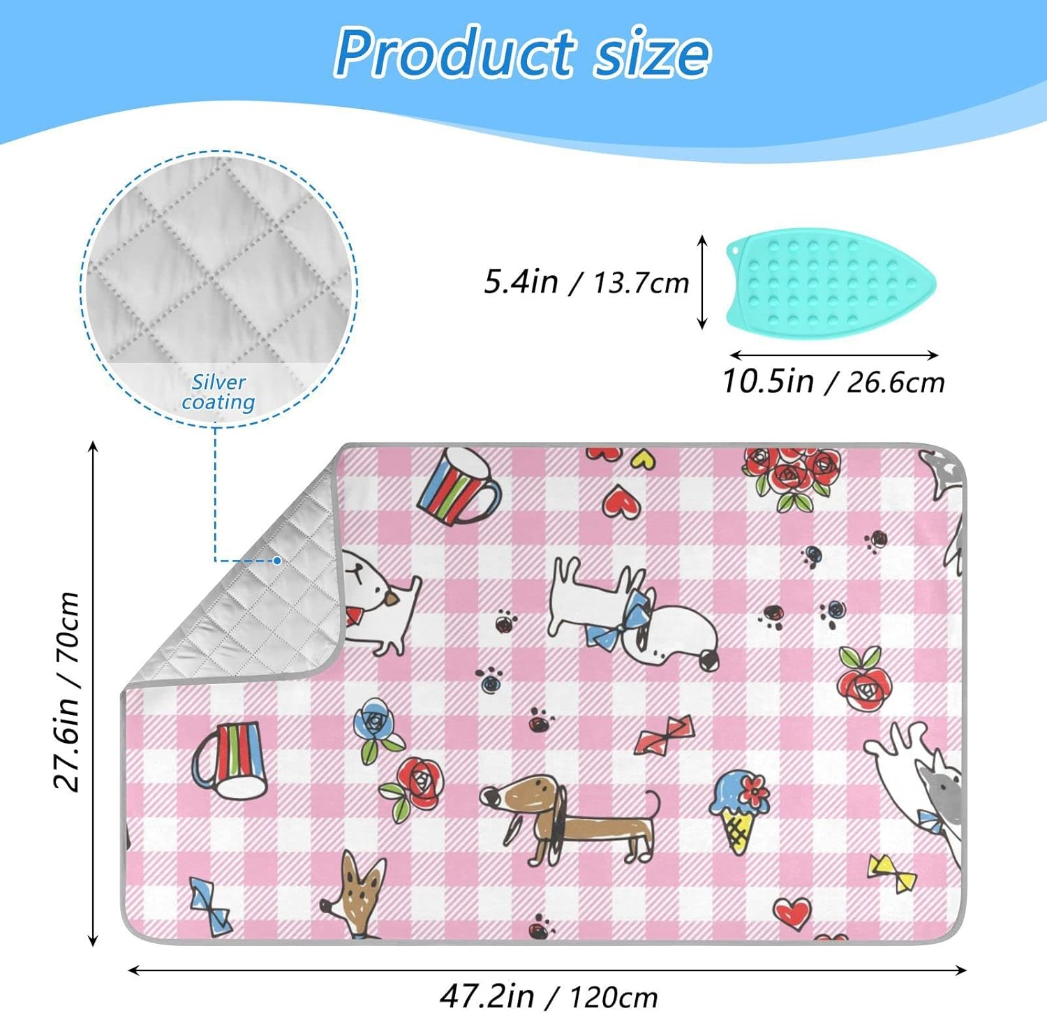 - Size: The size our ironing mat is 47.2 x 27.6 inch; the attached silicone ironing rest pad is 10.5 x 5.4 inch. Every package includes a ironing blanket and a silicone ironing rest pad