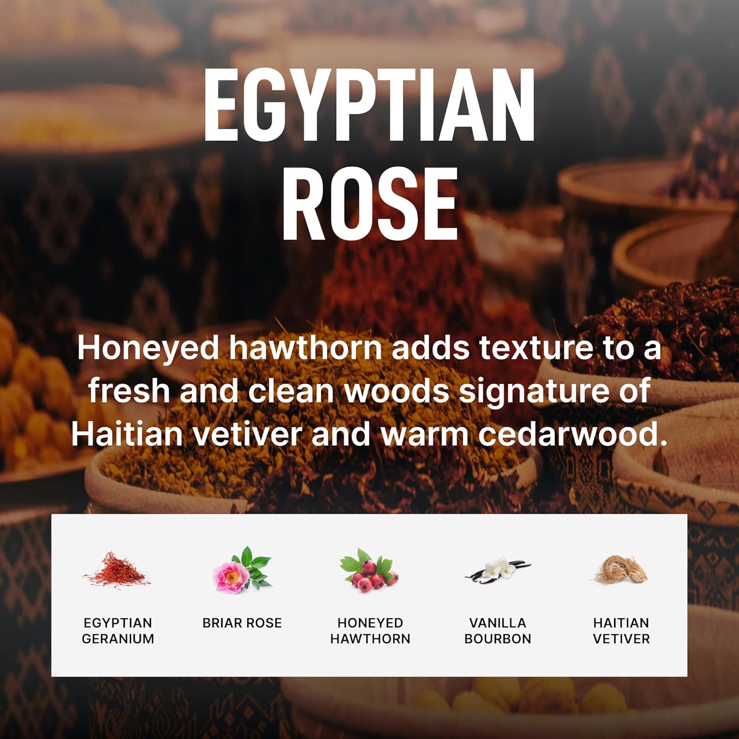 - Egyptian Rose: A seductive heart of exotic rose brought to life with warm nutmeg and clove spice. Honeyed hawthorn adds texture to a fresh and clean woods signature of Haitian vetiver and warm cedarwood. Creamy bourbon vanilla blended with a bed of soft white musk adds an addictive thread of velvety comfort.
