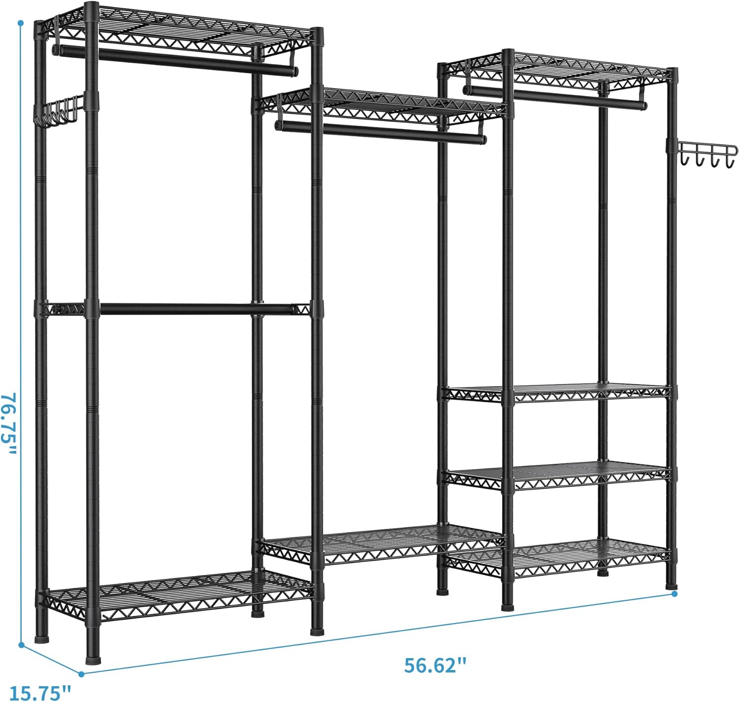 - Exceptional Strength and Capacity: Unleash the power of our Heavy Duty Garment Rack, meticulously engineered for superior strength. With dimensions measuring 15.75”D x 56.62”W x 76.75”H, this robust rack boasts an 800lbs load capacity, featuring individual hanging rods supporting up to 80 lbs each. Enjoy the freedom to organize and store a substantial wardrobe without compromising on stability or durability