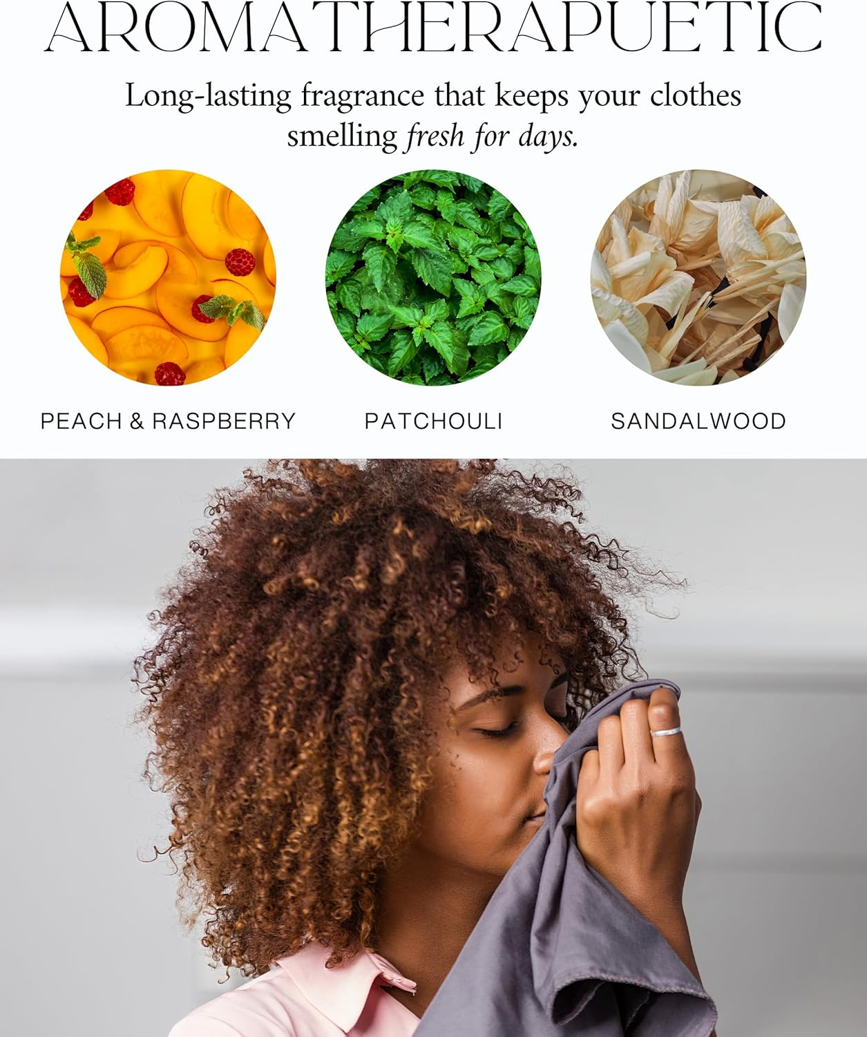- Luxurious Fragrance: Experience the enchanting aroma of peach, raspberry, patchouli, and sandalwood. Our carefully curated scent adds a touch of luxury to your laundry, enveloping your clothes in an irresistible fragrance.