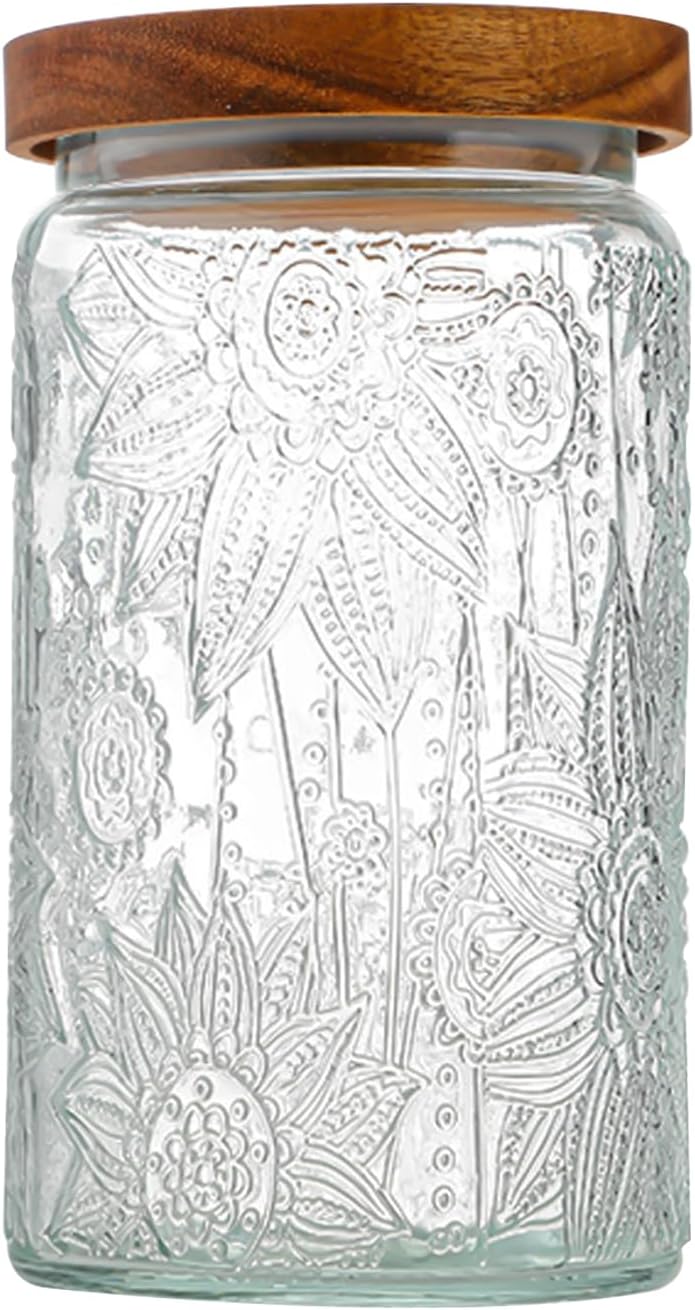 - 【VINTAGE GLASS JAR】Sunflower, begonia, window patterns and random wood grain lid of retro storage jar create a retro and unique decorative effect, transparent glass makes it easy to check the status and amount of food left over, practical and can decorate kitchen counter pantry and living room.