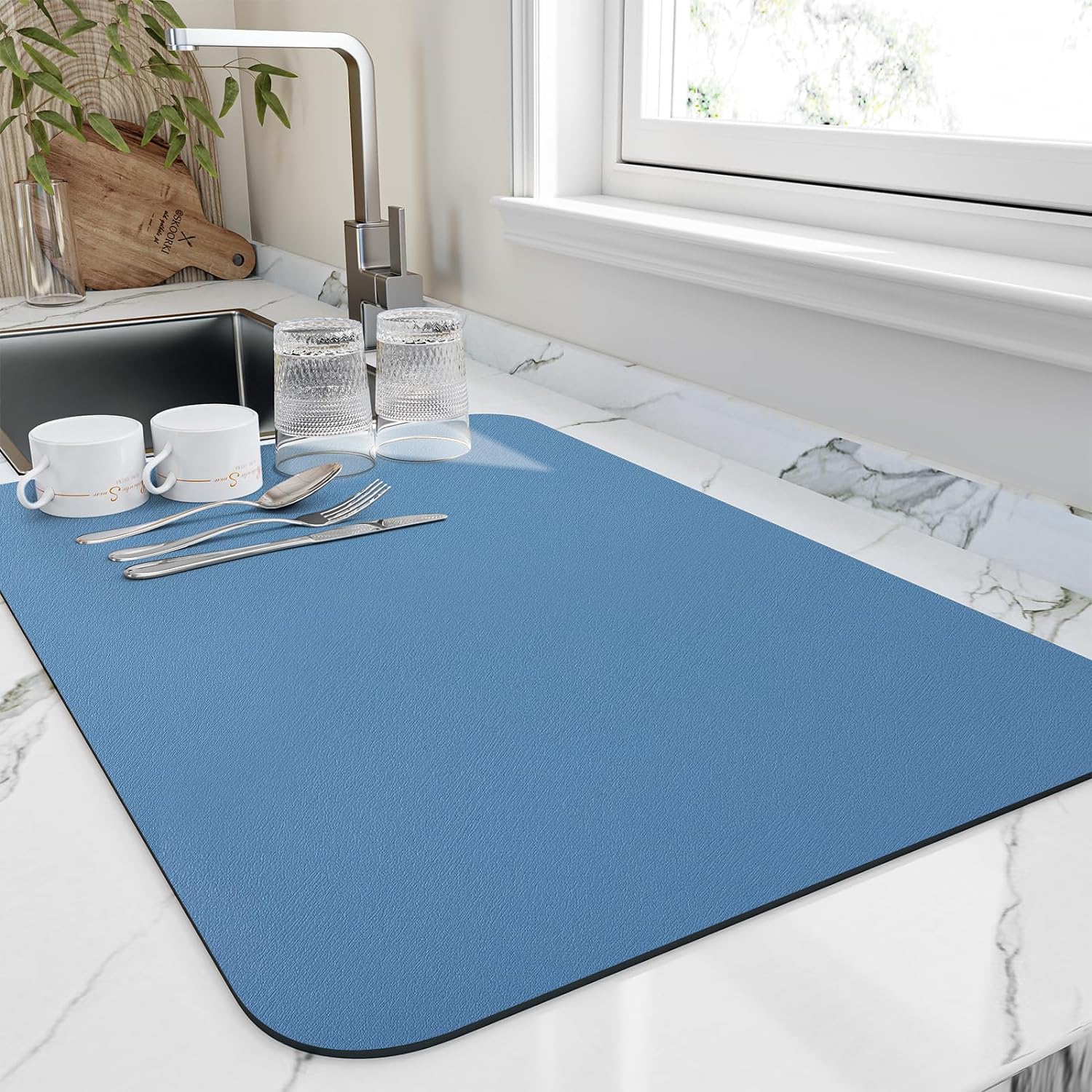 Dish Drying Mat for Kitchen Counter, Heat Resistant Drainer Mats with Non-slip Rubber Backed, Hide Stain Kitchen Super Absorbent Draining Mat, Easy to Clean Dish Rack Pad, Blue 16"x20"