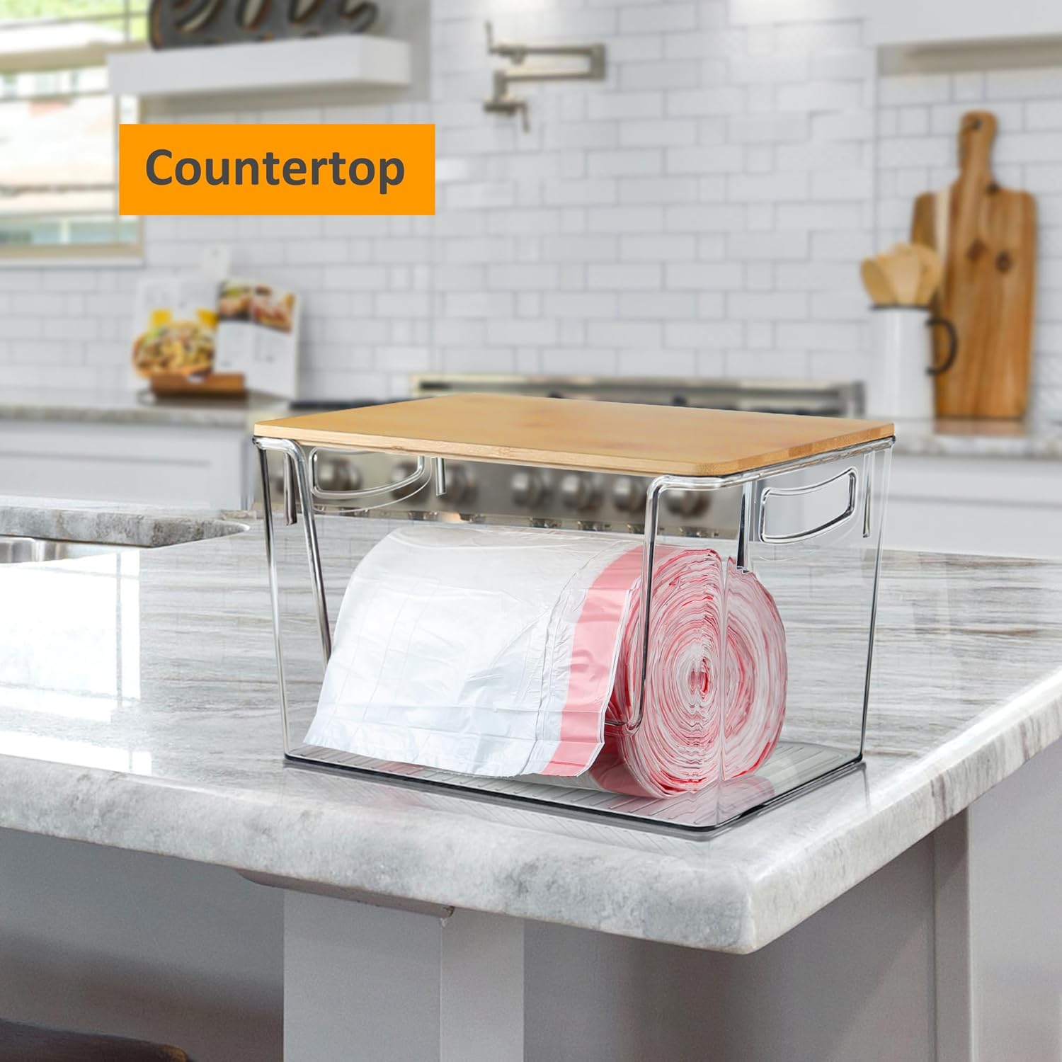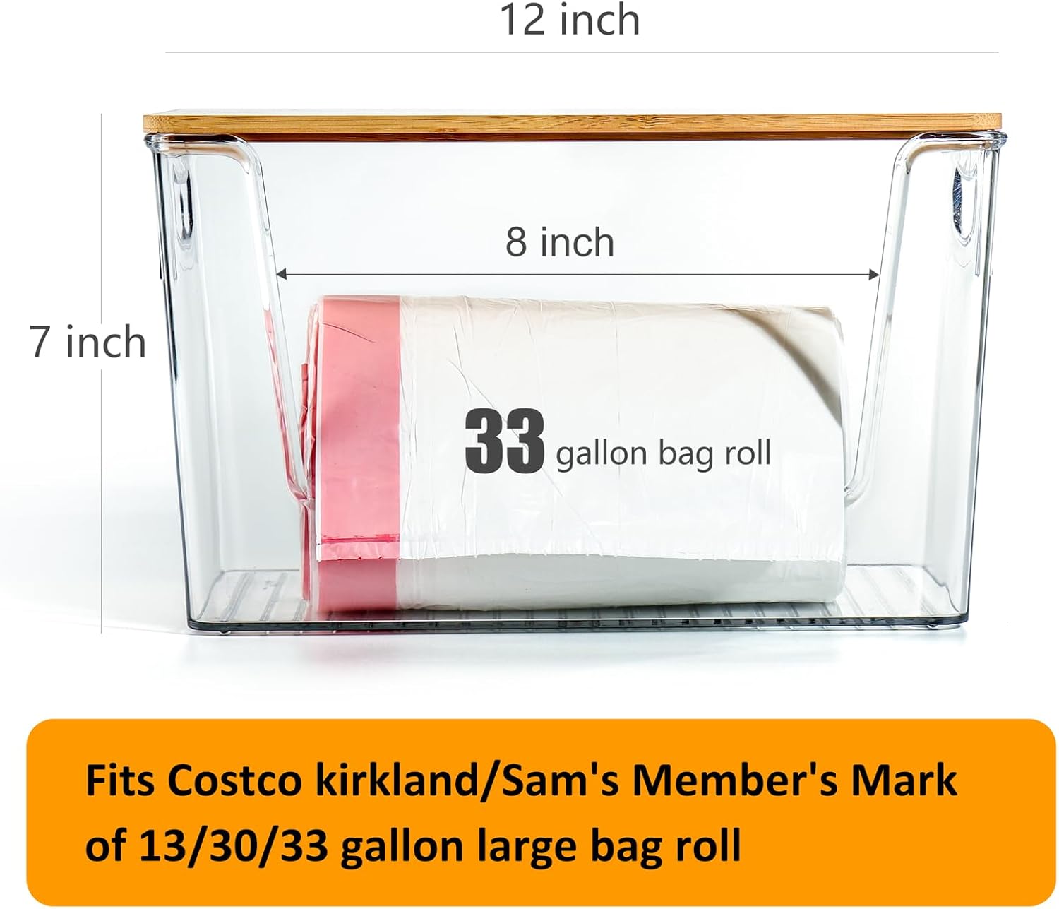 Hudgan Extra Large Trash Bag Holder Acrylic Trash Bag Dispenser Storage with Bamboo Top and Handles