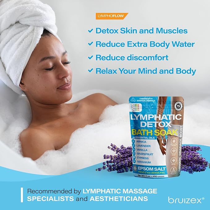 - BENEFITS: The Bruizex Lymphatic Drainage Bath Salts offer a multitude of benefits. As a full-body detox solution, it works wonders on muscle soreness lymphatic drainage all while being gentle on the skin. The salts leave your skin feeling smooth and silky after every bath. Perfect for a foot or full body soak, it provides a luxurious, fizzing, and bubbling bath experience, enhanced by an excellent scent that promotes a soothing and calming environment.