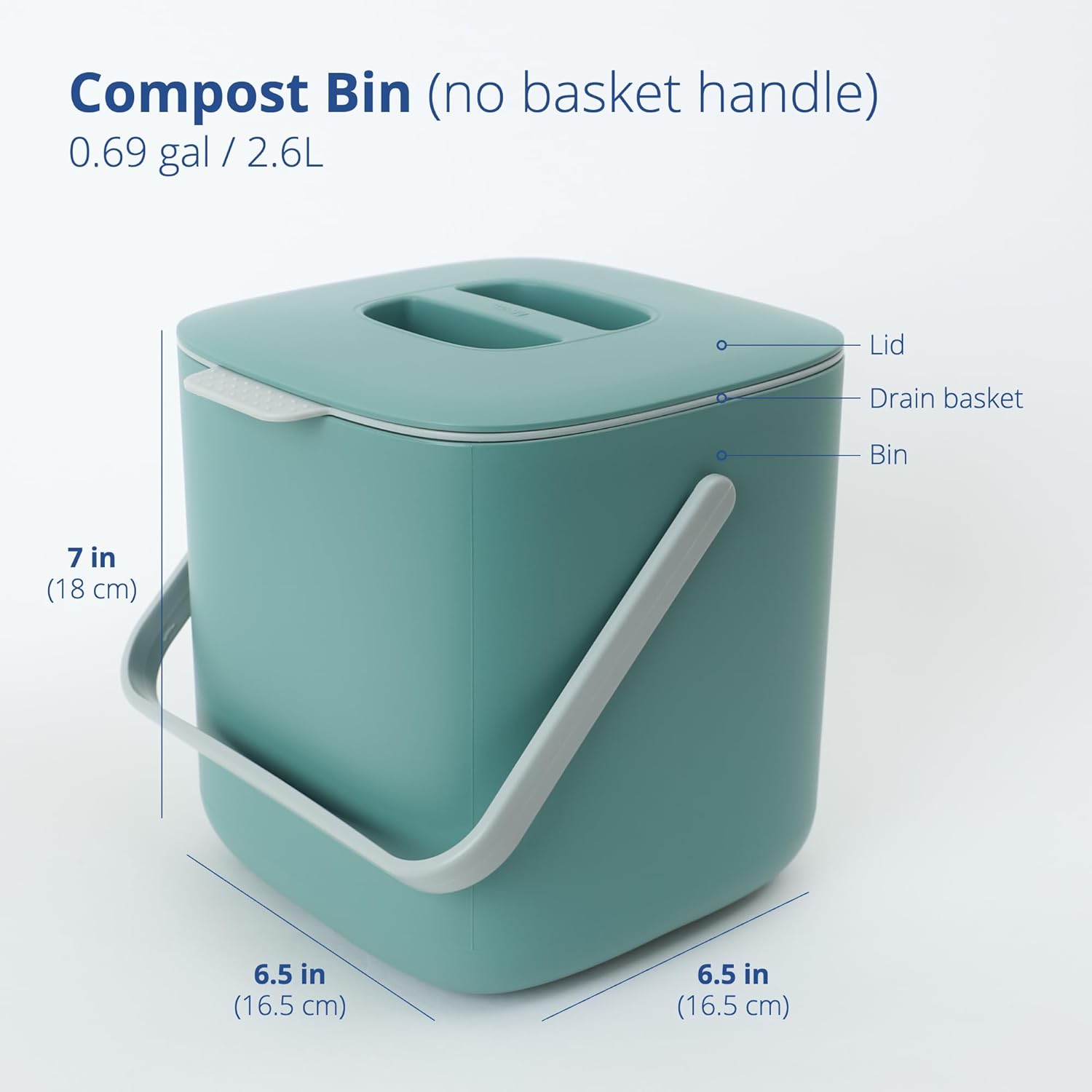 - AVAILABLE IN TWO SIZES - This small compost bin is perfect for a 2-person household. It has a capacity of 0.69 gallons or 2.6 Liters, and the outer dimensions measure W6.5 x H7 x D6.5 inches. This version does not feature a handle on the drain basket.