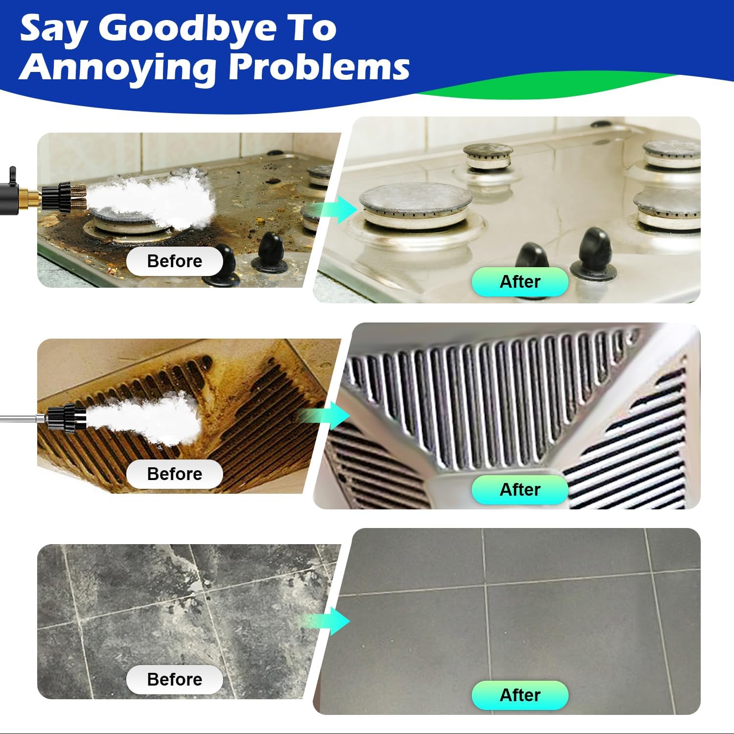 • Multipurpose Steam Cleaner - Handheld steam cleaners comes with a power cord and connectable extension hose, flexible and durable, it can provide greater reach for those hard-to-reach places. This high pressure steam cleaner can be used in many areas, it is suitable for kitchen, bathroom, floor, carpet, car and air conditioner.