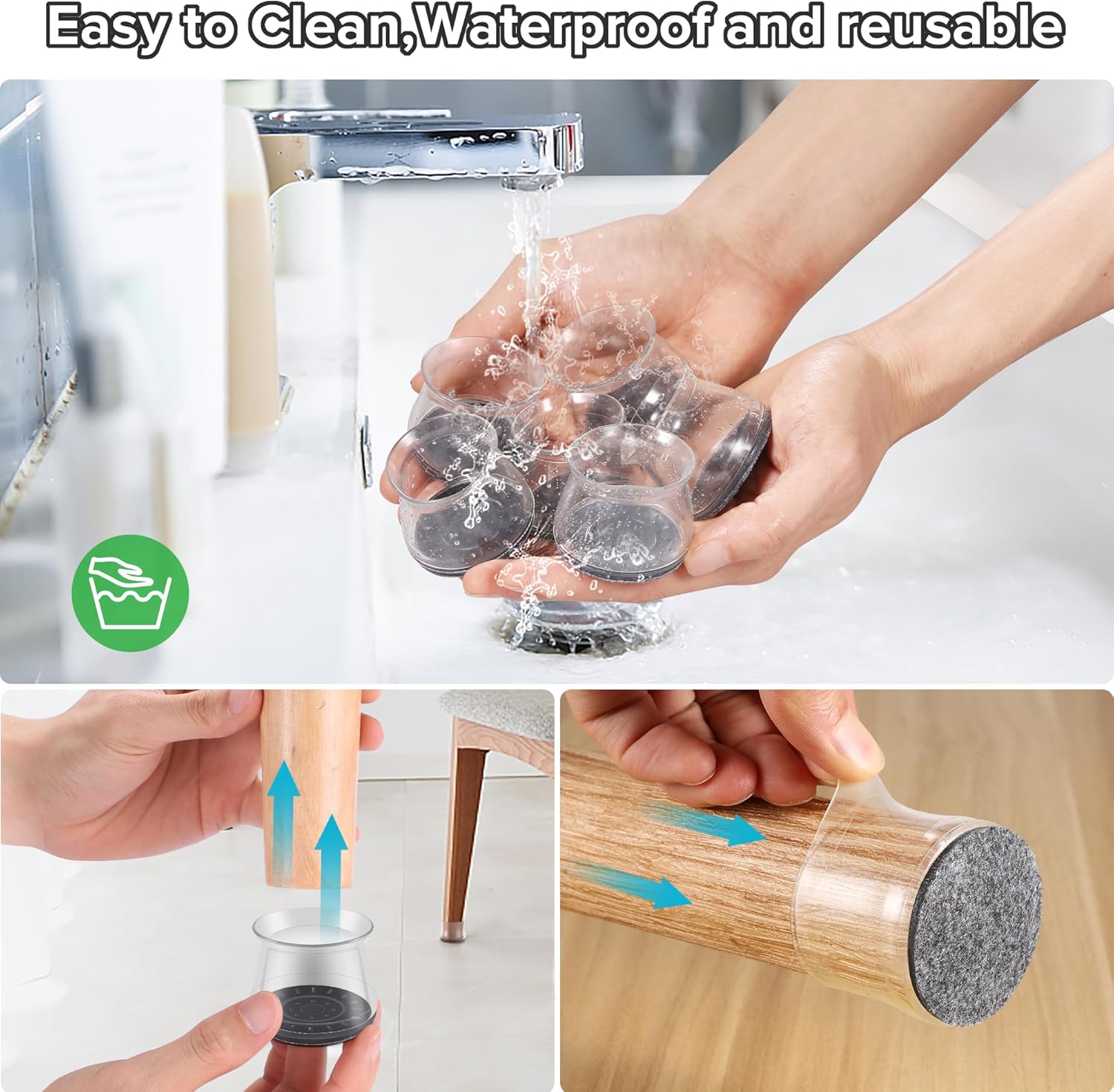 - ✅【Easy to Use】The chair leg covers to protect floors has high transparency, which greatly restore the original color of the table and chair legs, look more natural. The furniture leg cap is easy to install, without the use of tools. When the furniture chair socks are dirty, the chair stoppers can be cleaned and used repeatedly. Mainly suitable for smooth floors such as hardwood, tile, composite floor, and vinyl floor. Clear cap style match with most floors.