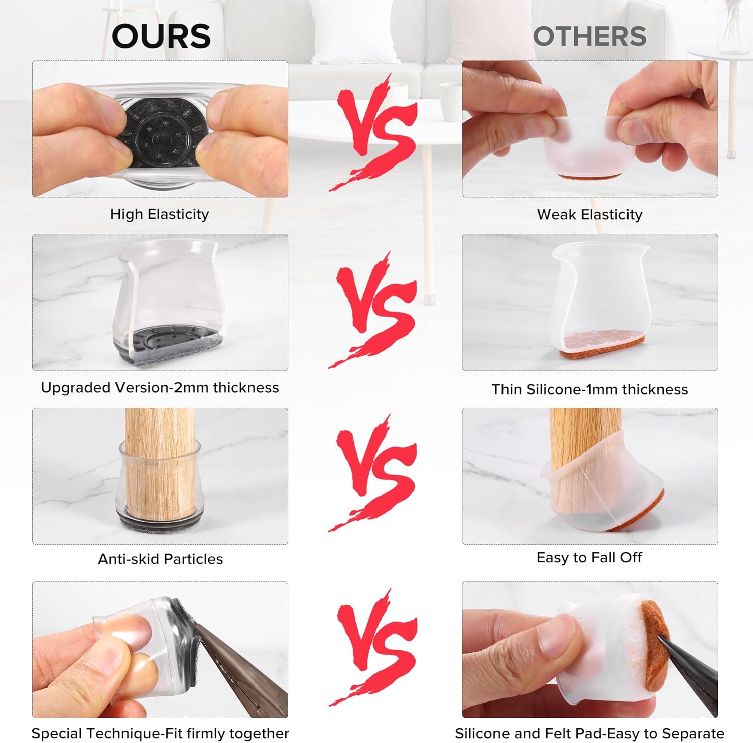 - ✅【Latest Upgrade】Compared with most of the traditional 1mm furniture pads on the market, our silicone chair leg protectors are made of 2mm thick silicone, which will never be damaged, durable. The ruby for chair legs will not change color when stretched. Inside of the inner sleeves are particles with anti-slip, which will firmly fix the chair and never make the covers fall off. Felt pads at the bottom make your furniture move silently and smoothly along floors without leaving marks and noise.