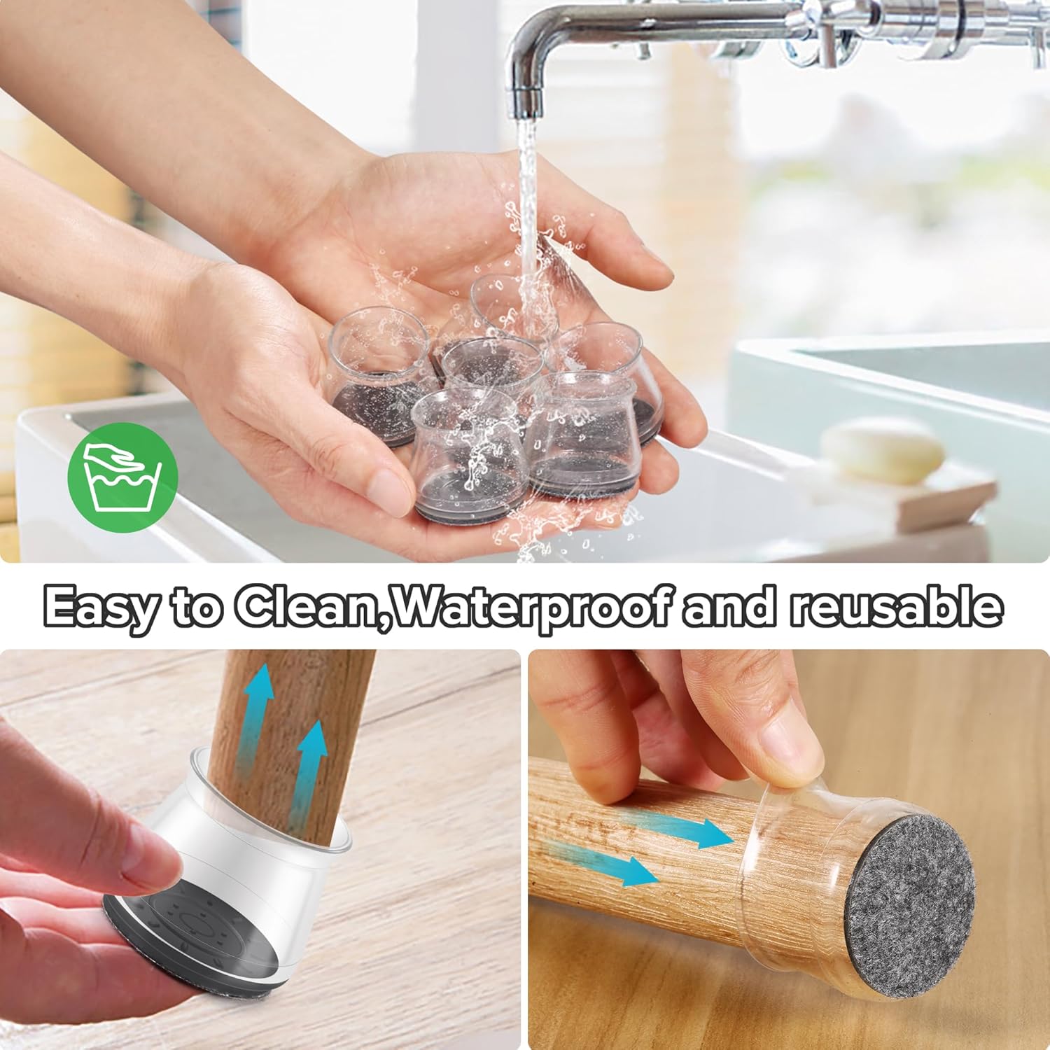 - ✅【Easy to Use】The chair leg covers to protect floors has high transparency, which greatly restore the original color of the table and chair legs, look more natural. The furniture leg cap is easy to install, without the use of tools. When the furniture chair socks are dirty, the chair stoppers can be cleaned and used repeatedly. Mainly suitable for smooth floors such as hardwood, tile, composite floor, and vinyl floor. Clear cap style match with most floors.
