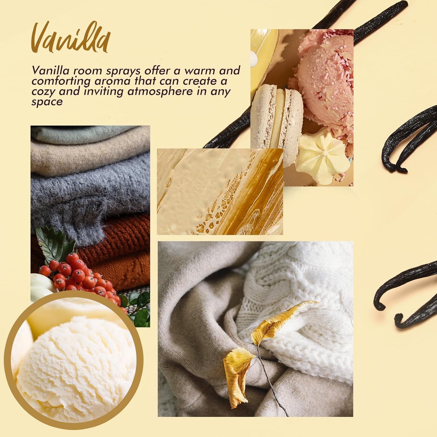 - Vanilla Scent: Warm vanilla fragrance; creates a cozy and inviting atmosphere in any room