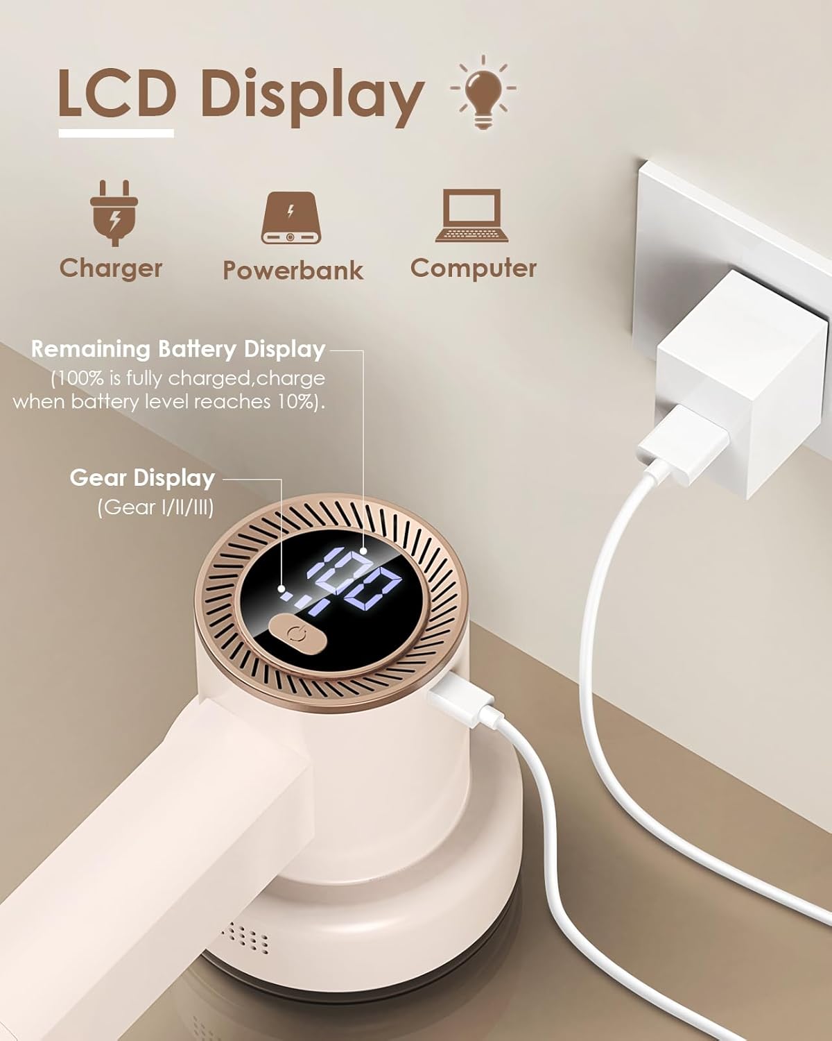 - 1. LED Digital Display - The fabric shaver fuzz remover can clearly show the remaining battery and speed gear on the LED screen. The battery level ranges from 0 to 100, you can directly see the battery remaining whether it is charging or in use, which is very convenient. Note: When the display battery level is less than 10, it needs to be charged