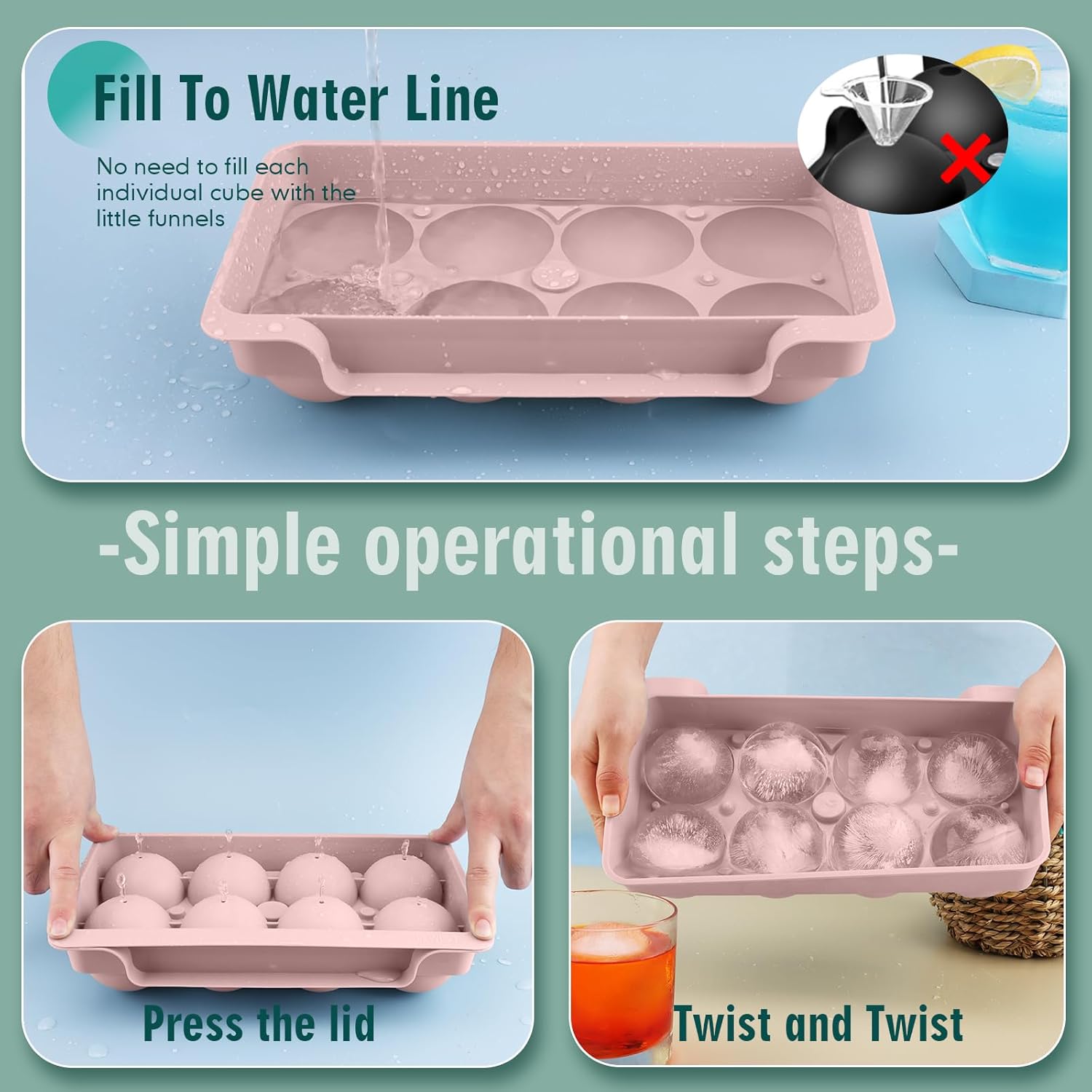 WIBIMEN Large Ice Cube Molds, Big Round Whiskey Ice Cube Trays for Freezer, Easy to Fill & Release, Whiskey Bourbon Cocktail(2.5In*8 Balls- Pink/2 Pack)