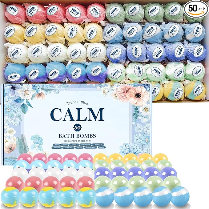 - Ideal Present Tips: TranquilBliss bath bombs are perfect for your mother, wife, girlfriend, sister, daughter, friend on Christmas, Valentine's Day, birthday party and other important days, because the 50pcs mega set can provide you with more options, you can choose to give a whole set to the other person directly, or you can choose a few of their favourite scents to give to them, so that you don't have to worry about choosing a present anymore
