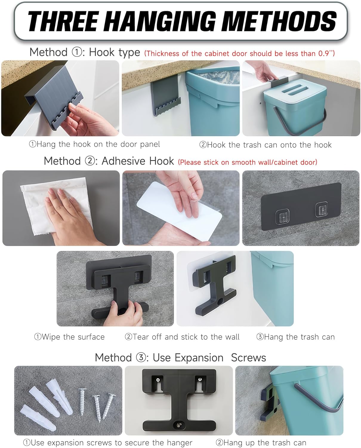 - ā [Under Sink / Wall Mount Trash Can] Hanging trash is an excellent choice for your daily activities. You can use it while you cook and then store it under the sink. Fit for most cabinet doors, pantry doors, cupboards, under sinks, walls, and countertops.
