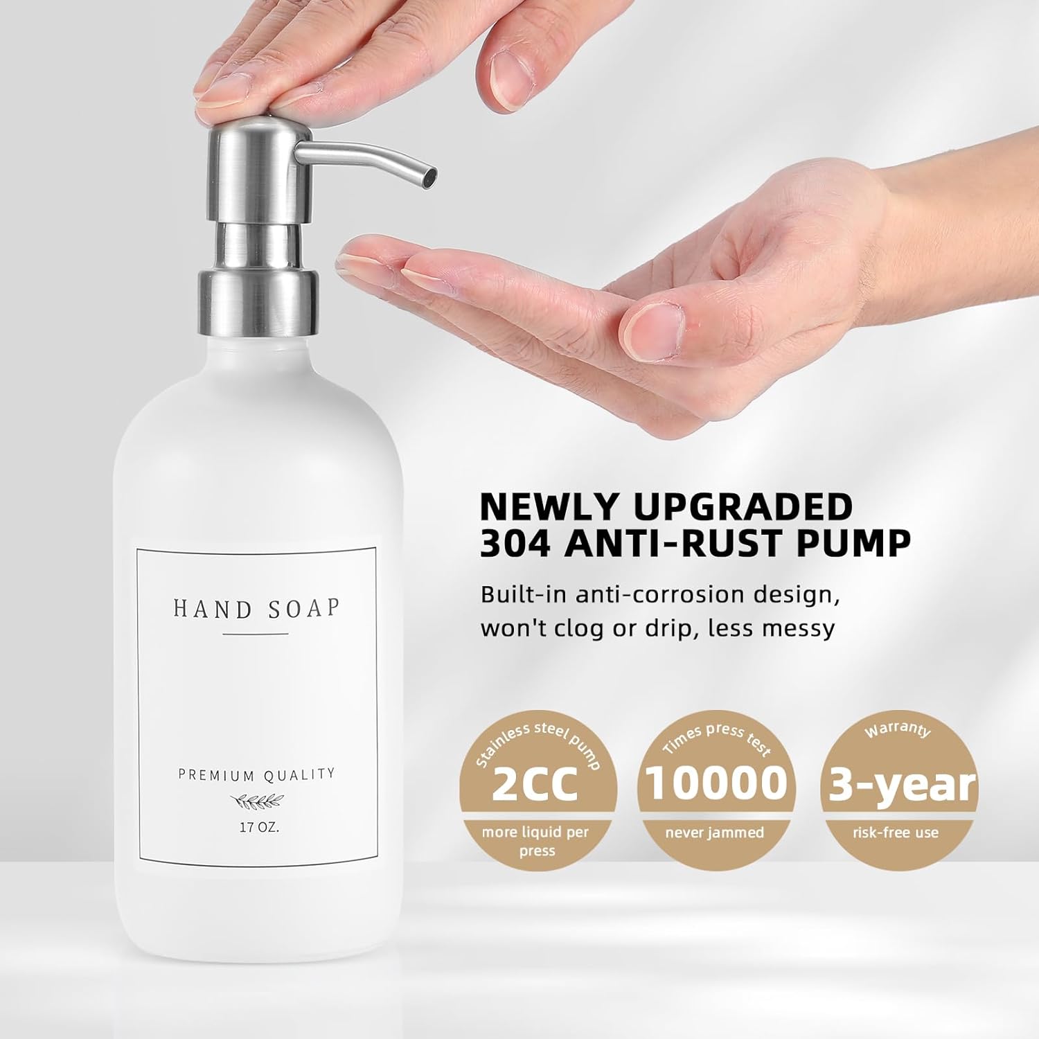 - Long-lasting 304 rust-proof pump: This hand soap dispenser for bathroom with New anti-corrosion stainless steel pump, works smoothly and easily, spout is curved, prevents any messy drips or spills, keeping your countertops clean and dry. Each pump delivers the perfect amount of soap and it doesn’t get clogged, sleek stainless steel pump not only add a touch of luxury but also make everyday tasks feel special, comes with a funnel to help restock easily.