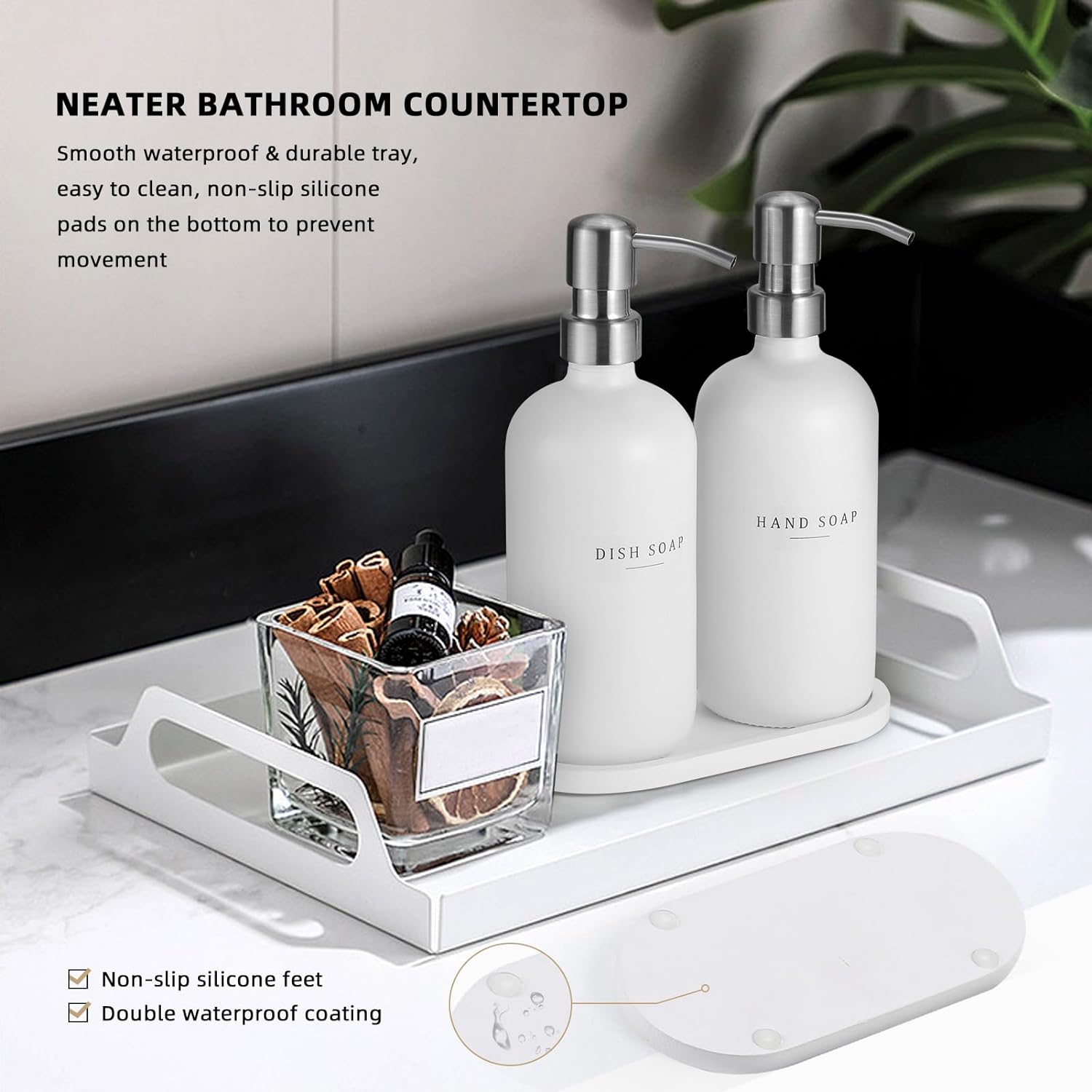 - Super organized and classy: Waterproof smooth tray keeps soap dispensers nicely together and keeps the counter more clutter-free, and doesn’t take up much room. The tray has a non-skid bottom keep bottle will stay in place during operation even when the counter is wet, also protect the counter from scratches. Add a touch of elegance to a boring sink area, get compliments about it whenever guests are over. ADD TO CART now.