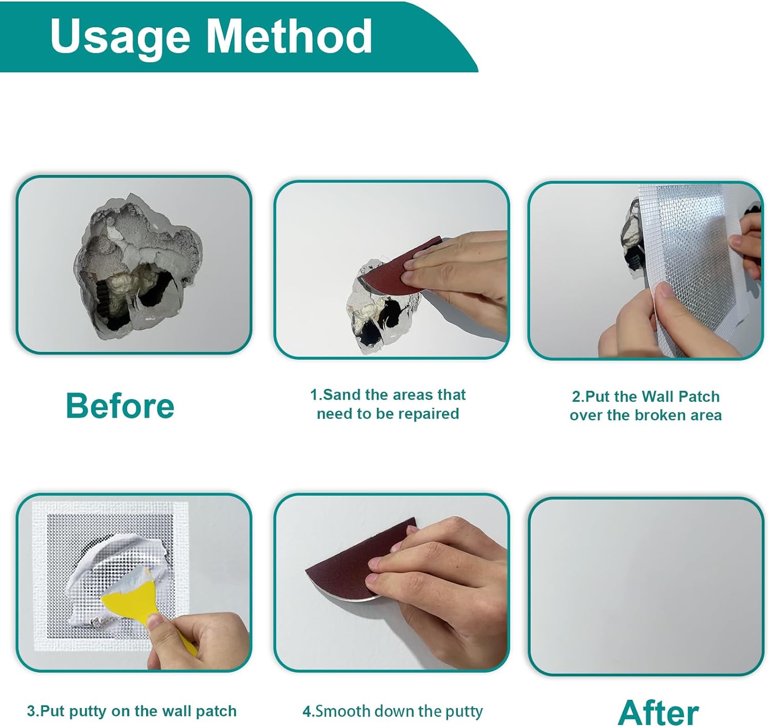 - Usage Method: Polish the area smooth with sandpaper, wipe it clean, and then apply a self-adhesive patch, cover with drywall mud, and smooth with the included scraper, polish the edges.