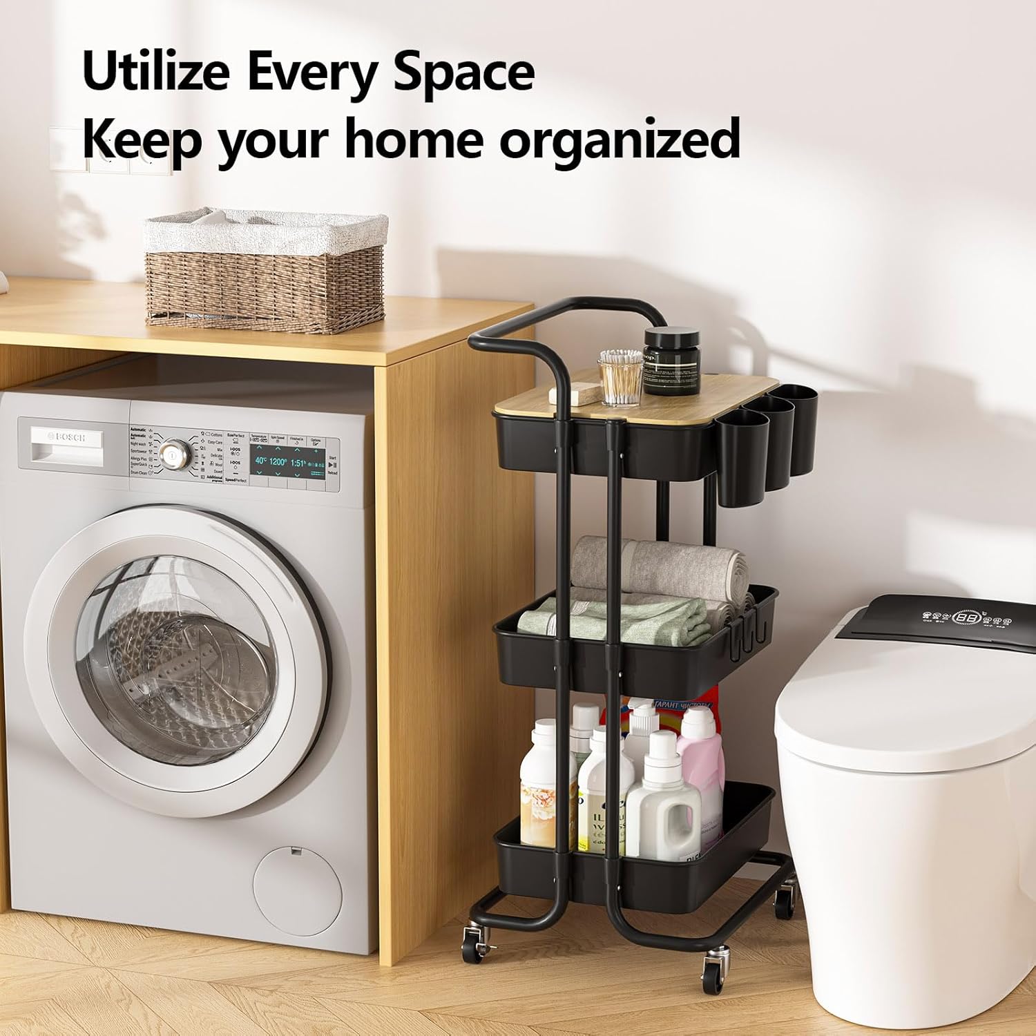 - 3 Tier Detachable Multifunctional Metal Rolling Cart with Metal handle,3 Hanging Cups,3 Hooks,1 Plank , 3 Plastic Storage Basket and 4 wheels including 2 Lockable Casters and 2 normal wheels. 3 tier rolling cart black, 3 drawer storage organizer black, 3 tier shelf black, 3 tier cart black, 3 tier storage organizer black, 3 tiered rolling cart black, 3 tier rolling cart metal black, 3 tier drawer organizer black, 3 tier metal rolling cart black, 3 tier cart with wheels black,