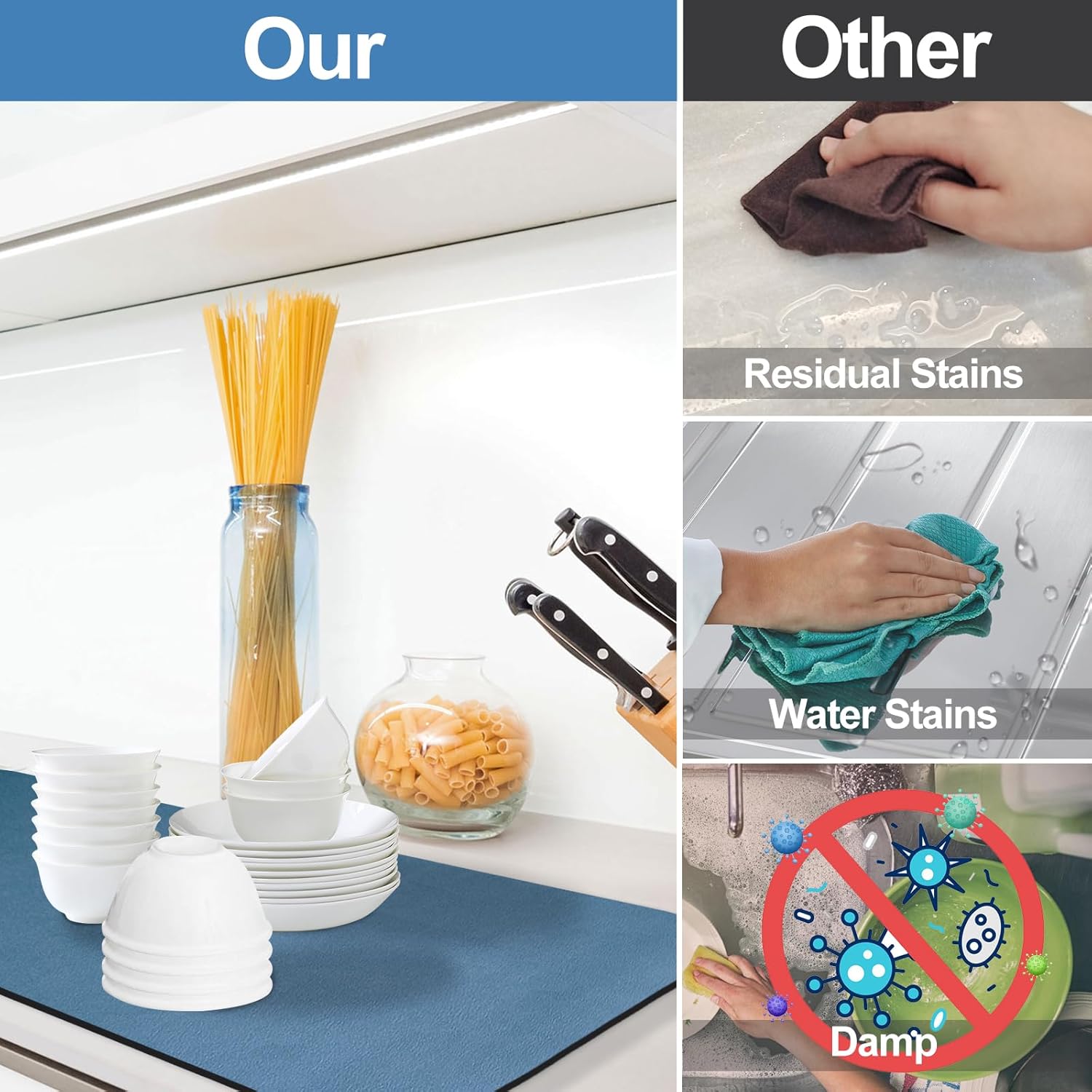 - Super Absorbent: Dish Drying Pad is made of super absorbent nano, the drying pad is soft and highly absorbent, which can dry quickly. In addition, the drying mat is thick enough to better protect countertops, tableware, and glassware from damage and contamination.