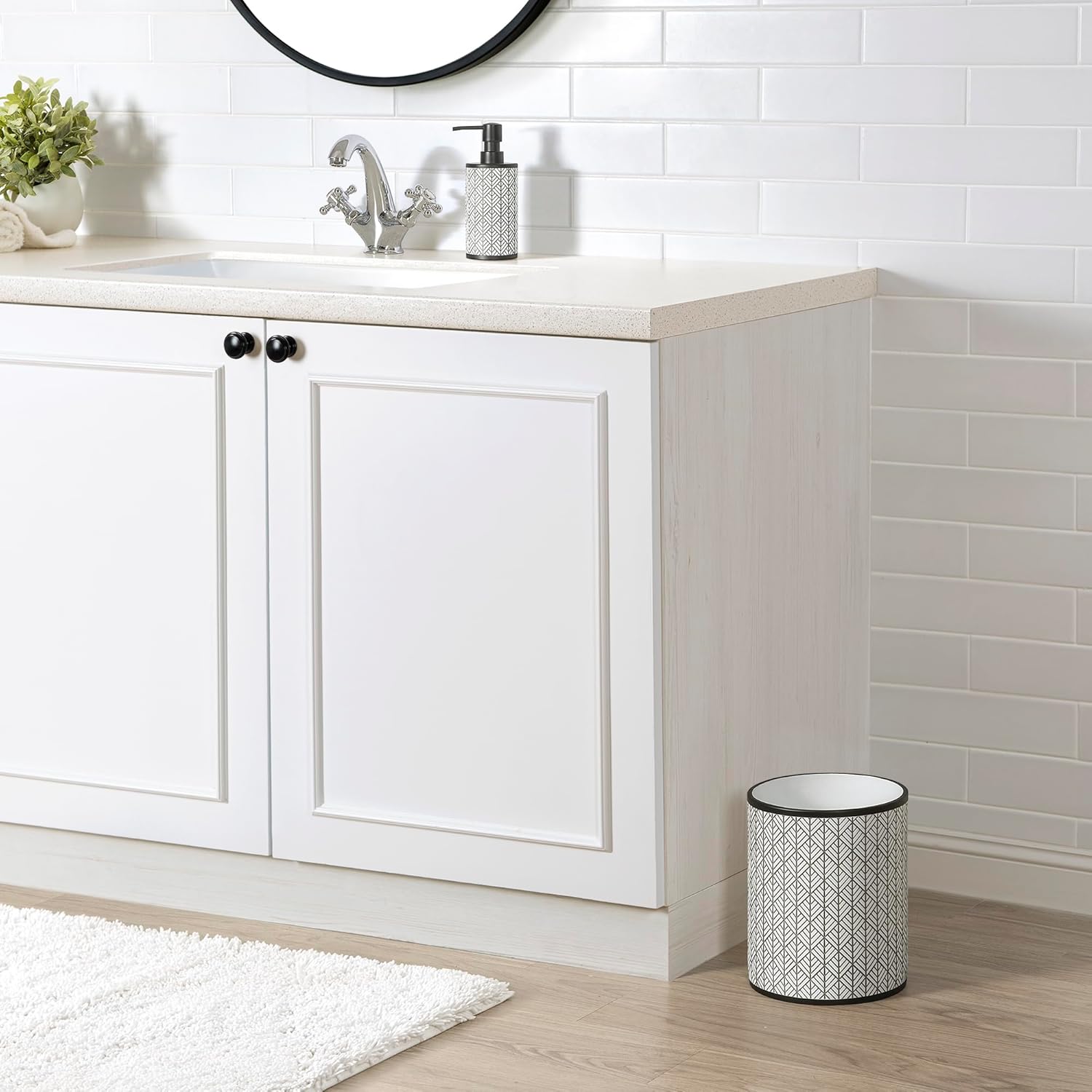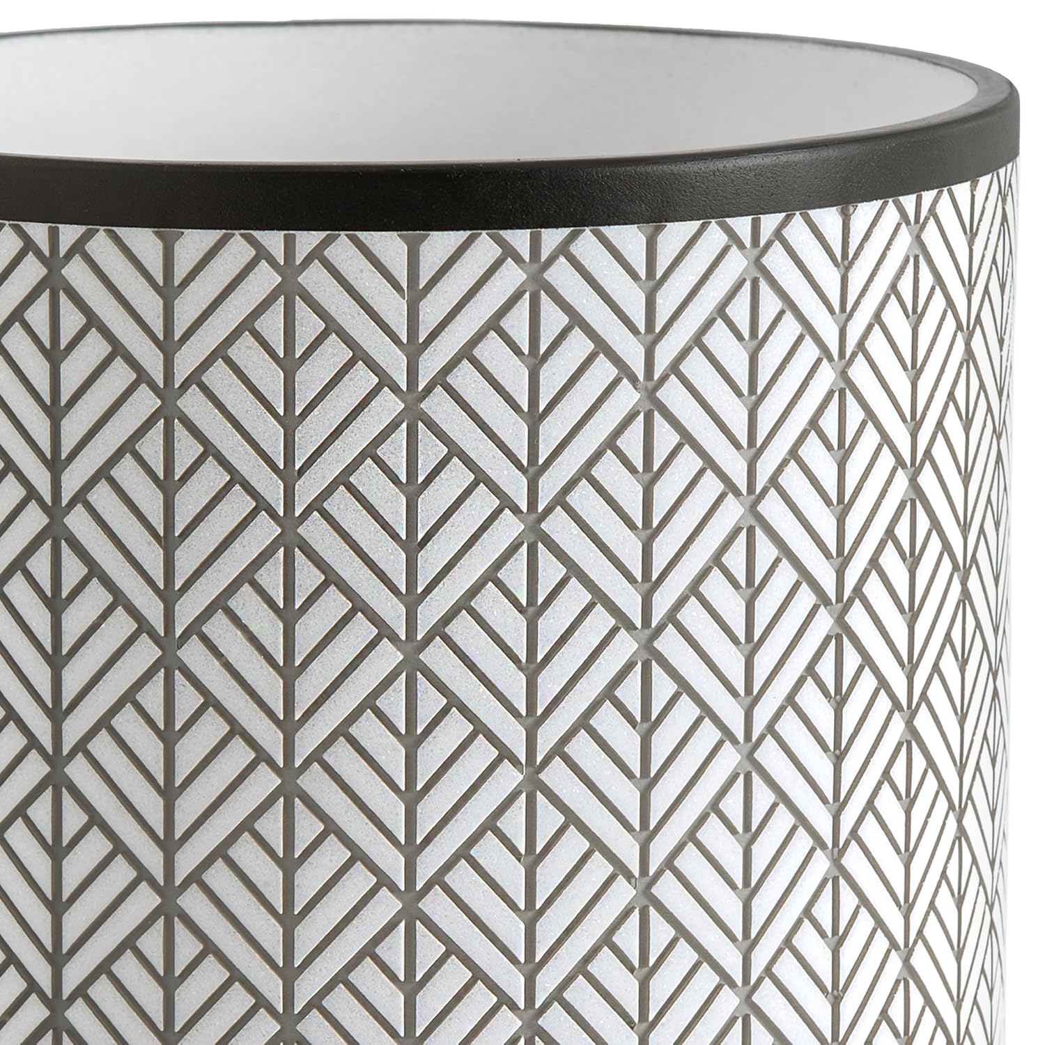 - Updated and sleek debossed liner geometric designed wastebasket in charcoal and white with black trim, offers sophisticated style to your bathroom