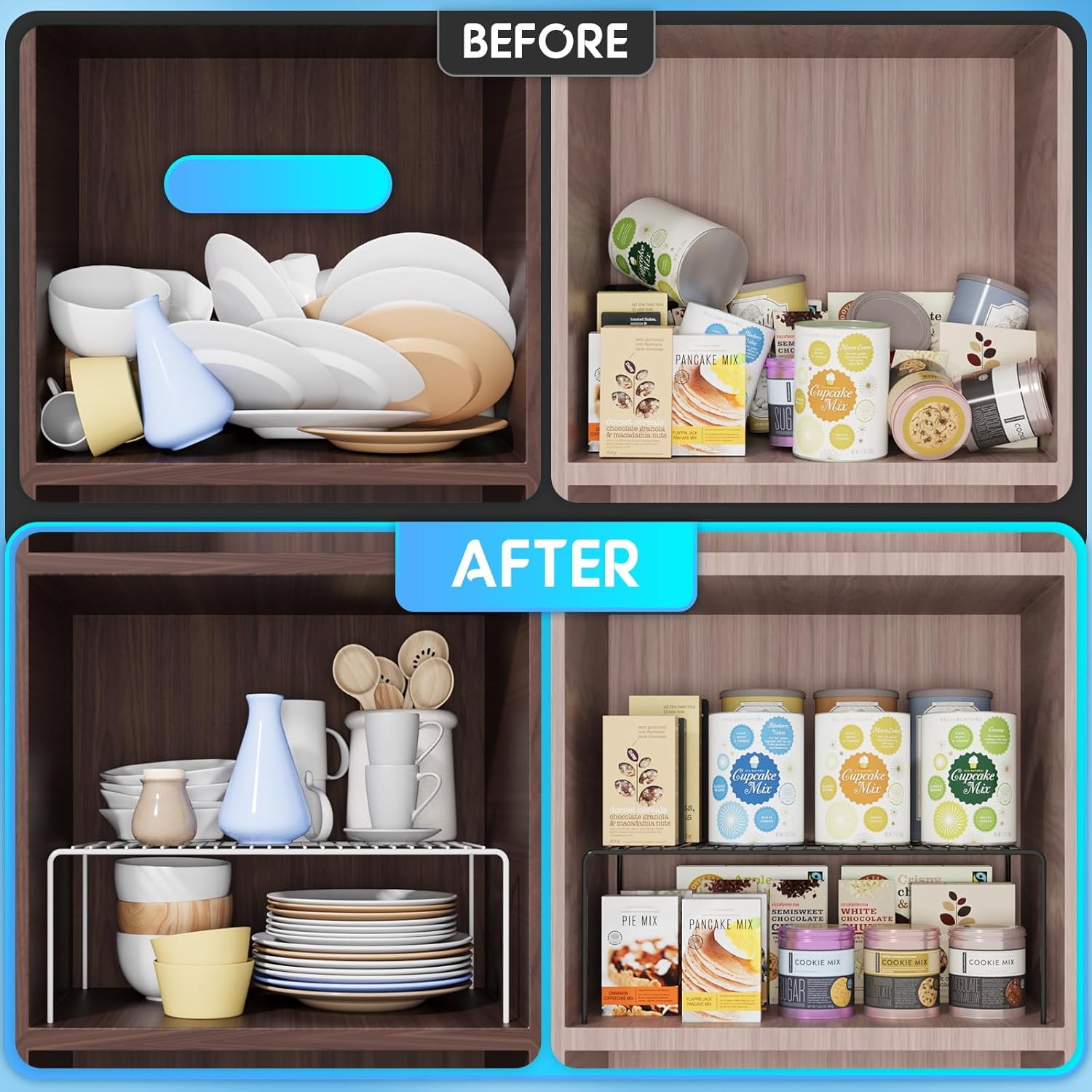 - Space Saver Help Shelves: This set of 4 helper shelves will double your space! Perfect for keeping everything organized in kitchen cupboards, pantries, bathroom cabinets, closets, counter tops, under the sink, or anywhere you need extra room