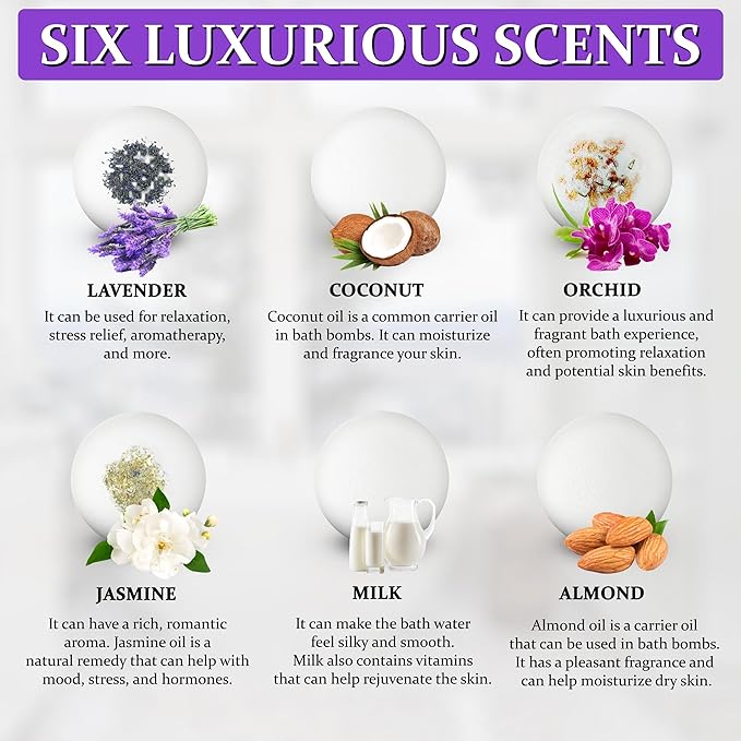 - Variety of subtle aromas: Enjoy a wide range of scents, including lavender, jasmine, milk, orchid, coconut, and almond, allowing you to choose the perfect aroma for every mood. Carefully crafted: Cocoa butter, avocado oil, blend of subtle essential oils, sea salt, baking soda, citric acid, corn starch, each bath ball contains 100 gr / 3,52 oz of freshness and softness