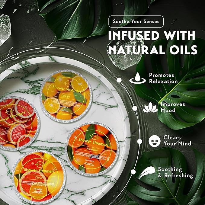 - Shower Tablets with Natural Essential Oils - Our shower bombs aromatherapy are infused with natural essential oils that have mood-boosting properties: uplifting Orange, invigorating Grapefruit, revitalizing Citrus, and mood-booster Mandarin.