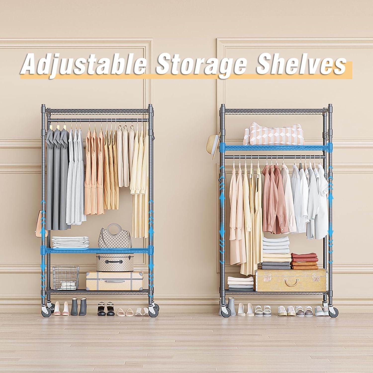 - 【LOCKABLE 360° WHEELS】 Equipped with 4 rolling wheels, 2 of them are locking wheels, designed to allow you to roll this clothing garment rack where ever you need in home. Easy access to bedroom, cloakroom, clothing store, laundry room, walk-in closet and more