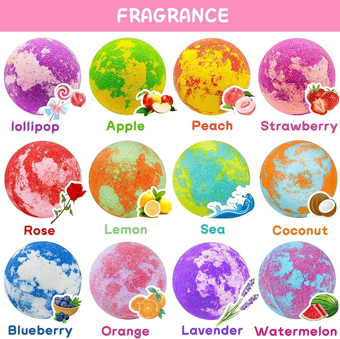 - 🦄UNICORN GIFT SET FOR GIRLS: There are 12 pcs of bubble bath bombs with natural scented smell of kid’s favorite including lavender bath bombs, watermelon bath bombs, rose bath bombs,peach bath bombs, green apple bath bombs, sea bath bombs for kids.