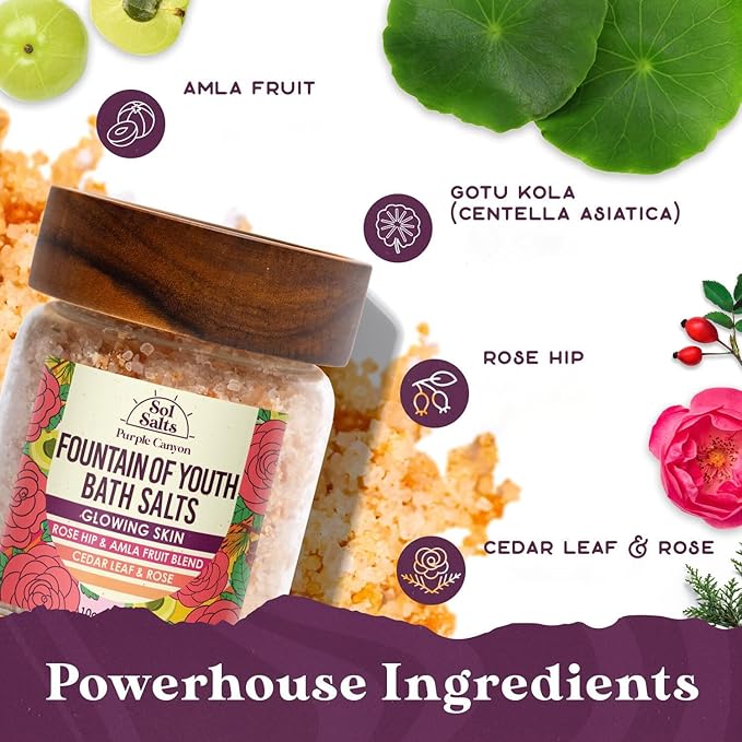 - ๐๐๐ฏ๐ข๐ญ๐๐ฅ๐ข๐ณ๐ & ๐๐ฅ๐จ๐ฐ: Immerse yourself in the revitalizing embrace of Purple Canyon SolSalts Fountain of Youth Bath Salts. Our bath soak combines the anti-aging powers of Amla Fruit Powder and Rose Hip Powder with the detoxifying benefits of Dead Sea Salt, Epsom Salt, and Pink Himalayan Sea Salt. Experience a regenerative bath that leaves your skin glowing and youthful.