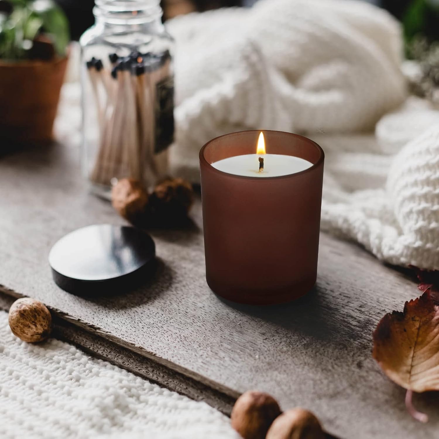 - [Glass Candle Vessel] A perfect fall candle jars for making candles. Designed with wood lid and glass , stylish appearance, simple and modern, can be used as elegant home decoration, candlelight through the amber candle jars, create a warm family atmosphere.