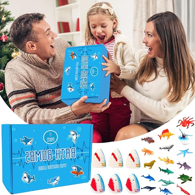 - Shark Ocean Bath Bombs - 4 bath bombs in the shape of a shark with blood in its mouth. Each surprise is wrapped in a clear casing so the surprise won't get stained or damaged. I hope this little educational surprise will make your child fall in love with bathing and enjoy playing in the water. A box of 4 random surprises