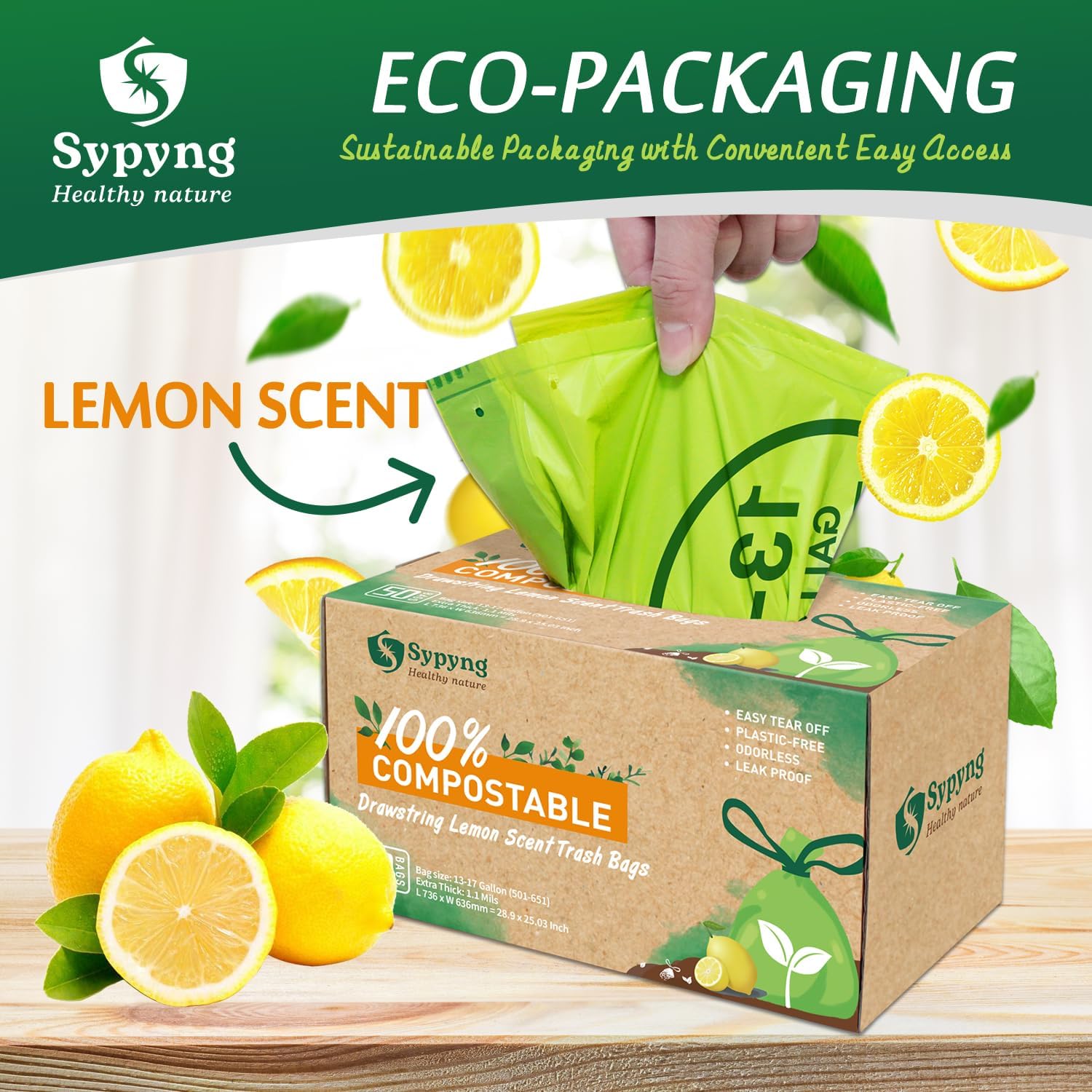 - COMPOSTABLE TRASH BAGS – Made from eco-friendly materials, our 13–17 gallon large trash bags are 100% biodegradable and compostable. Lightly lemon-scented for a fresh, clean smell, they’re perfect for kitchen scraps and food waste. Certified to meet ASTM D6400 and OK Compost HOME standards, these bags break down naturally in your home compost bin—providing a convenient and responsible alternative to plastic bags.