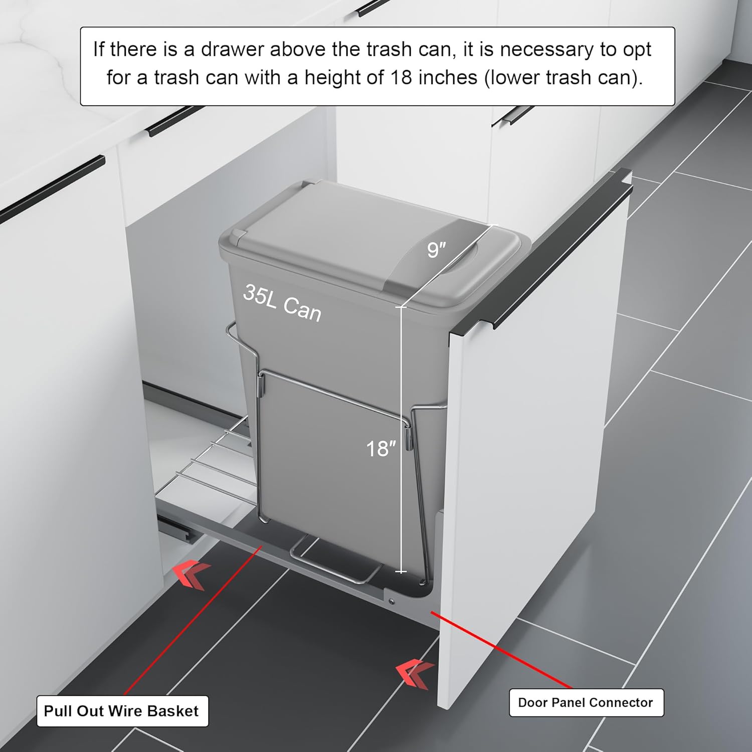 - VERSATILE USE: Maximize kitchen space and keep trash, recyclables or bulky items like pet food bags out of site and away from toddlers and pets. Can be attached to the cabinet door (pulling door open will pull out bin) or not attached to door (when door is opened, bin is pulled out separately)