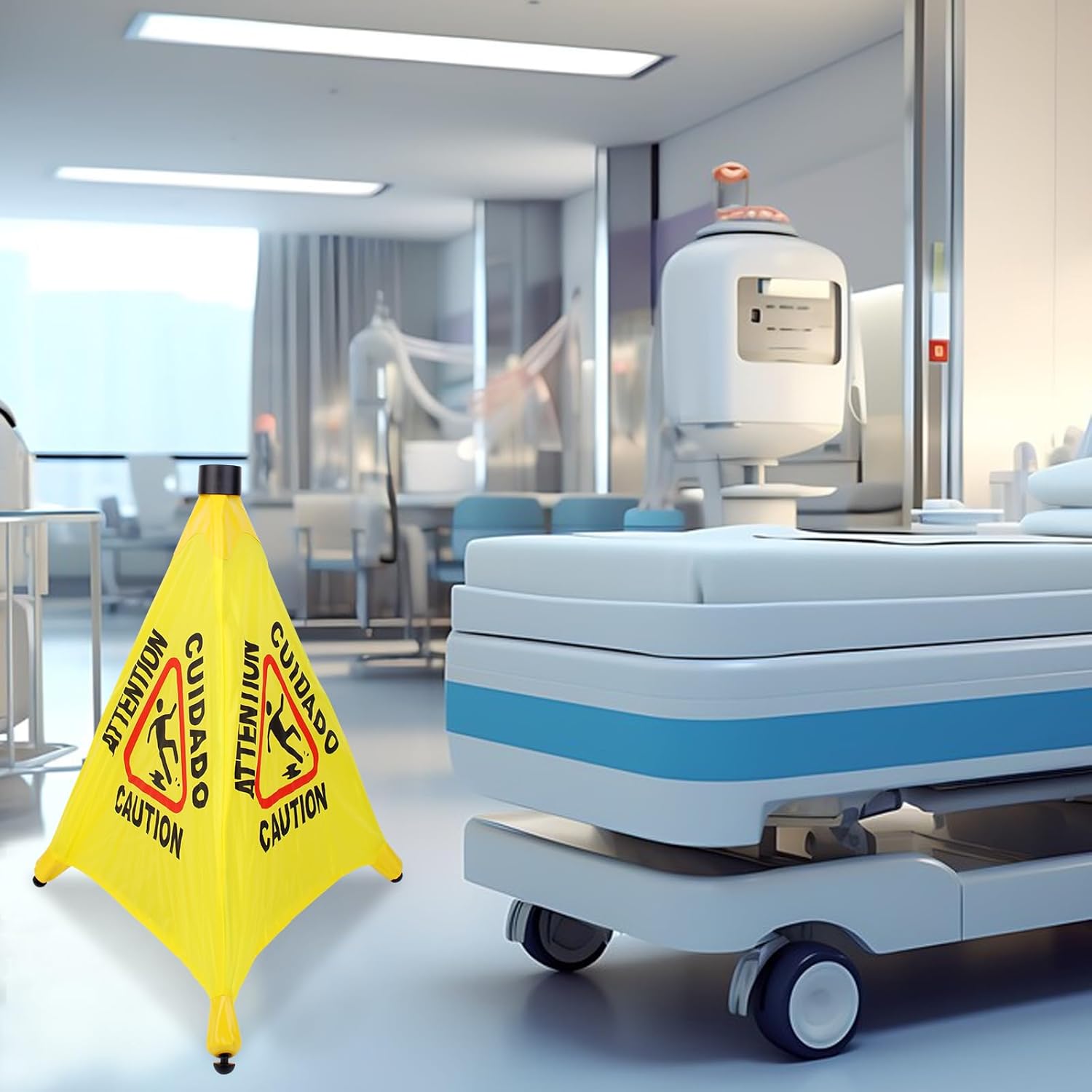 - User-Friendly Design: This pop-up floor sign is printed clearly in both English and Spanish on both sides. The 3-sided design ensures high visibility from multiple directions. Bold text and graphic icons effectively draw attention to potentially hazardous areas.