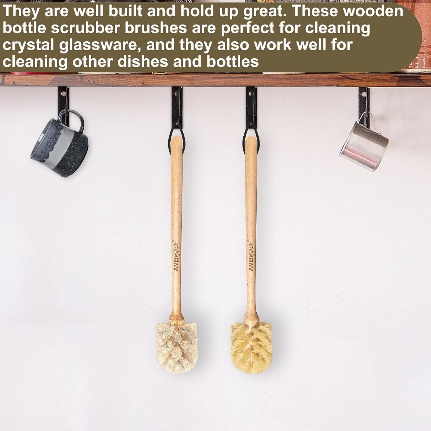 - Dual-Brush Set with Sisal and Horsehair Bristles – This 2-pack includes one brush with tough sisal/tampico bristles for heavy-duty scrubbing and one with soft horsehair bristles for delicate cleaning. The natural fiber bottle brushes are perfect for removing residue and stains from bottles, glasses, and more without scratching your kitchenware.