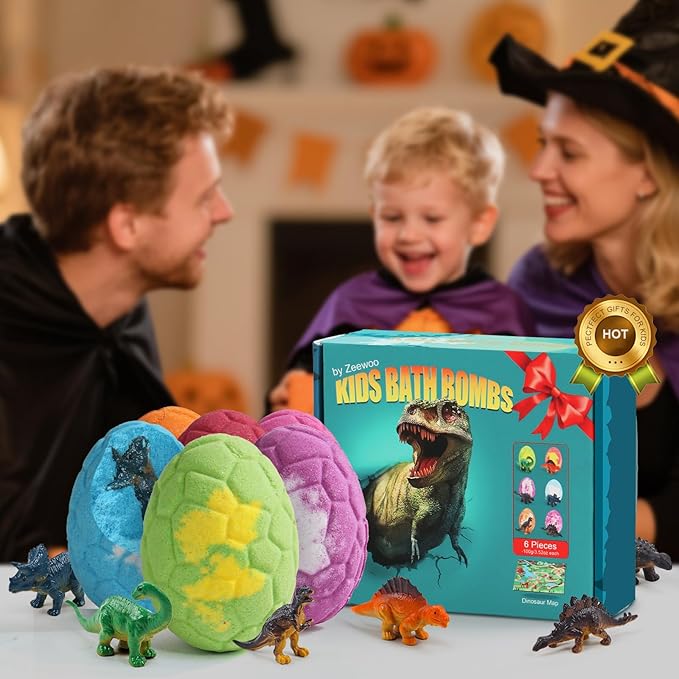 - 🧑【6 Colorful Bath Bombs Set for Kids】Prepare Christmas stocking stuffers for kids. Our bath bombs set contains 6 different individually packaged dino egg bath bombs, each of which has a different color and scent( Cucumber/Milk Honey/Marmalade/Oceans/Strawberry/Candyfloss)and also contains 6 different dinosaur toys inside. Once dropped the bath bombs in water, they will float and fizz, giving the water a vibrant color and releasing essential oils aroma. The dinosaur toys also reveal when the bath bombs fizzes out. These bath bombs make bath time fun, no more fighting with kids to take bath!